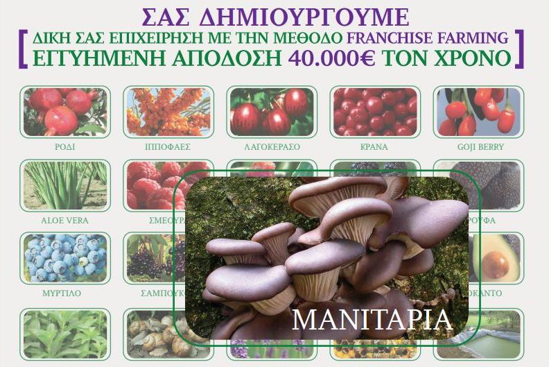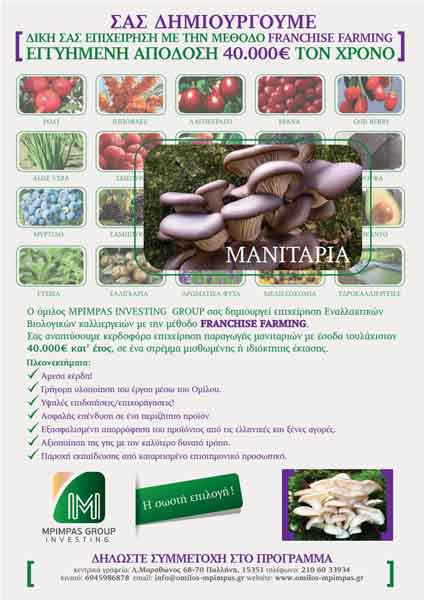 Με δεδομένη την ύπαρξη στην πατρίδα μας χιλιάδων αγροτεμαχίων χωρίς αξιοποίηση ή εκμετάλλευση από τους ιδιοκτήτες τους, ο Όμιλος Mpimpas Investing Group ανακοίνωσε ένα ρηξικέλευθο επιχειρηματικό σχέδιο το οποίο αφορά στον πρωτογενή τομέα και συγκεκριμένα την καλλιέργεια μανιταριών πλευρώτους σε ιδιόκτητη ή μισθωμένη έκταση τουλάχιστον 1 στρέμματος, με τη μέθοδο του franchise, που για πρώτη φορά εφαρμόζεται στην Ελλάδα για γεωργικές καλλιέργεις.