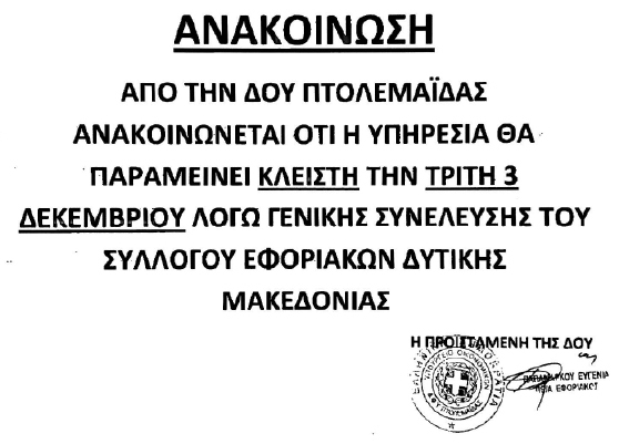 Κλειστή θα παραμείνει η ΔΟΥ (Δημόσια Οικονομική Υπηρεσία) Πτολεμαΐδας την Τρίτη 3 Δεκεμβρίου, λόγω γενικής συνέλευσης του Συλλόγου Εφοριακών Δυτικής Μακεδονίας.