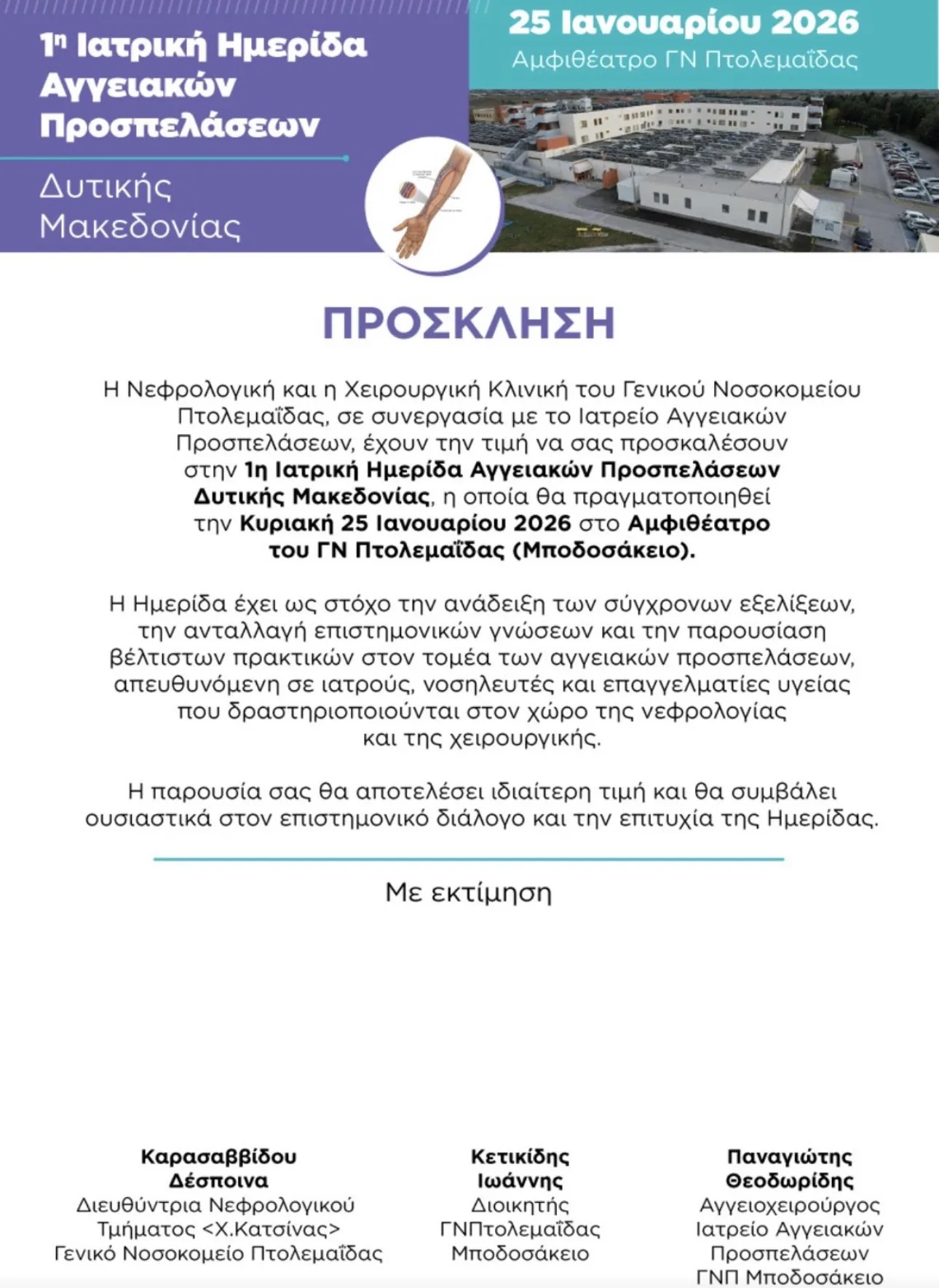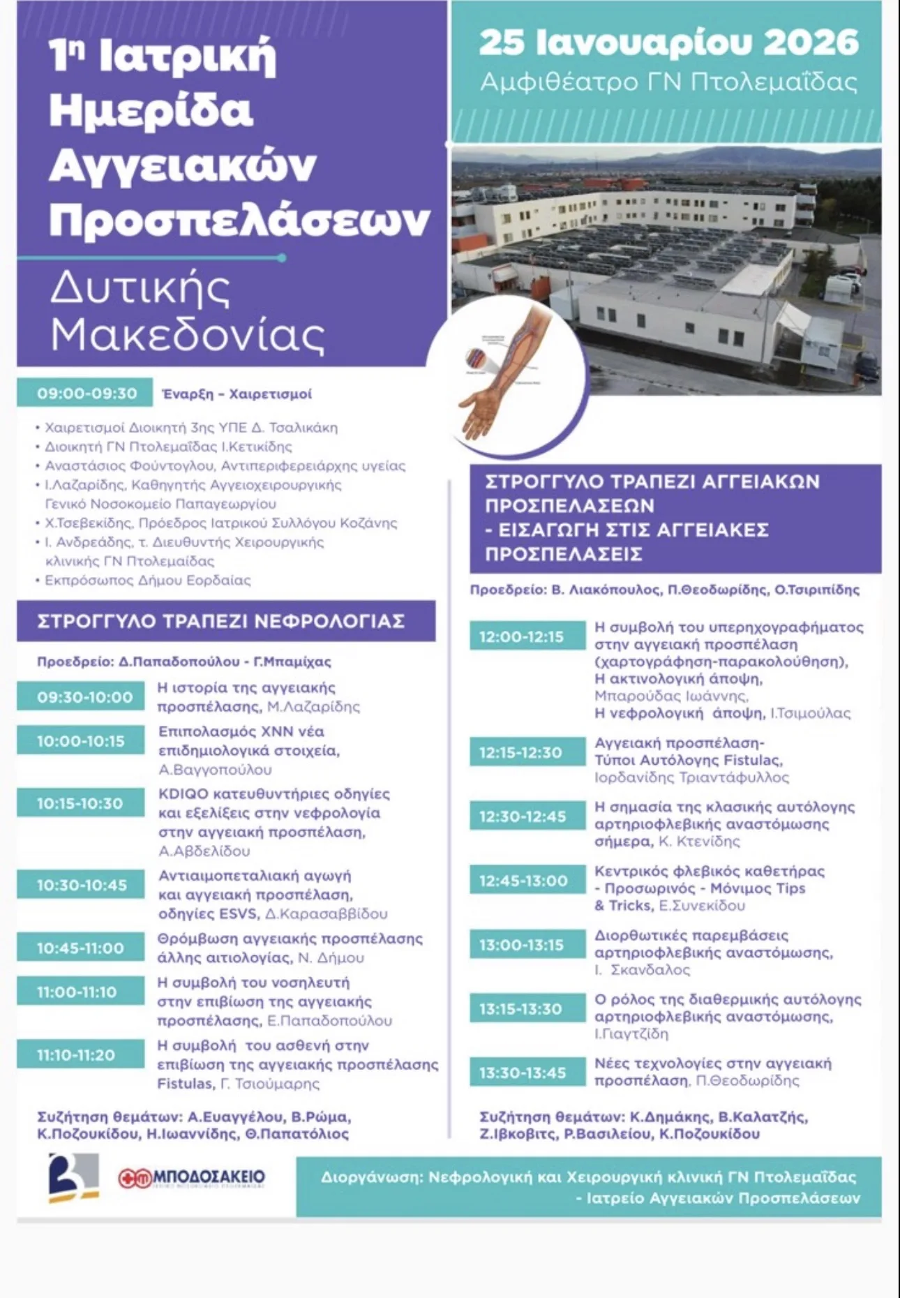 Η Νεφρολογική και η Χειρουργική Κλινική του Γενικού Νοσοκομείου Πτολεμαΐδας, σε συνεργασία με το Ιατρείο Αγγειακών Προσπελάσεων, έχουν την τιμή να σας προσκαλέσουν στην 1η Ιατρική Ημερίδα Αγγειακών Προσπελάσεων Δυτικής Μακεδονίας, η οποία θα πραγματοποιηθεί την Κυριακή 25 Ιανουαρίου 2026 στο Αμφιθέατρο του ΓΝ Πτολεμαΐδας (Μποδοσάκειο).