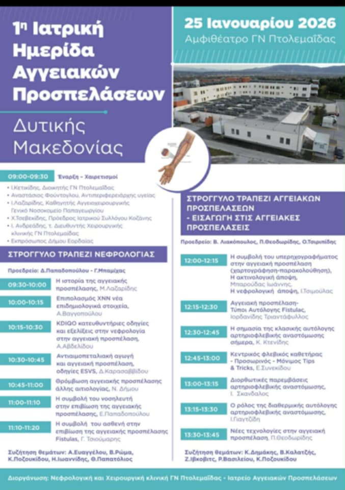 Η 1η Ιατρική Ημερίδα Αγγειακών Προσπελάσεων Δυτικής Μακεδονίας θα πραγματοποιηθεί την Κυριακή 25 Ιανουαρίου στο Αμφιθέατρο του Γενικού Νοσοκομείου Πτολεμαΐδας «Μποδοσάκειο». Την Ημερίδα διοργανώνουν η Νεφρολογική και Χειρουργική Κλινική ΓΝ Πτολεμαΐδας και το Ιατρείο Αγγειακών Προσπελάσεων. Μετά την έναρξη και τους χαιρετισμούς θα πραγματοποιηθεί το Στρογγυλό Τραπέζι Νεφρολογίας και το Στρογγυλό Τραπέζι Αγγειακών Προσπελάσεων – Εισαγωγή στις Αγγειακές Προσπελάσεις.