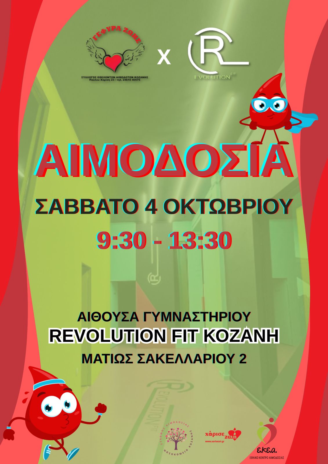 To Σάββατο 4 Οκτωβρίου 2025 από τις 09:30 – 14:00 (προσέλευση μέχρι 13:30) στο χώρο του γυμναστηρίου Revolution Fit (Ματιώς Σακελλαρίου 2) με την Αιμοδοσία του Γ.Ν. Κοζάνης.