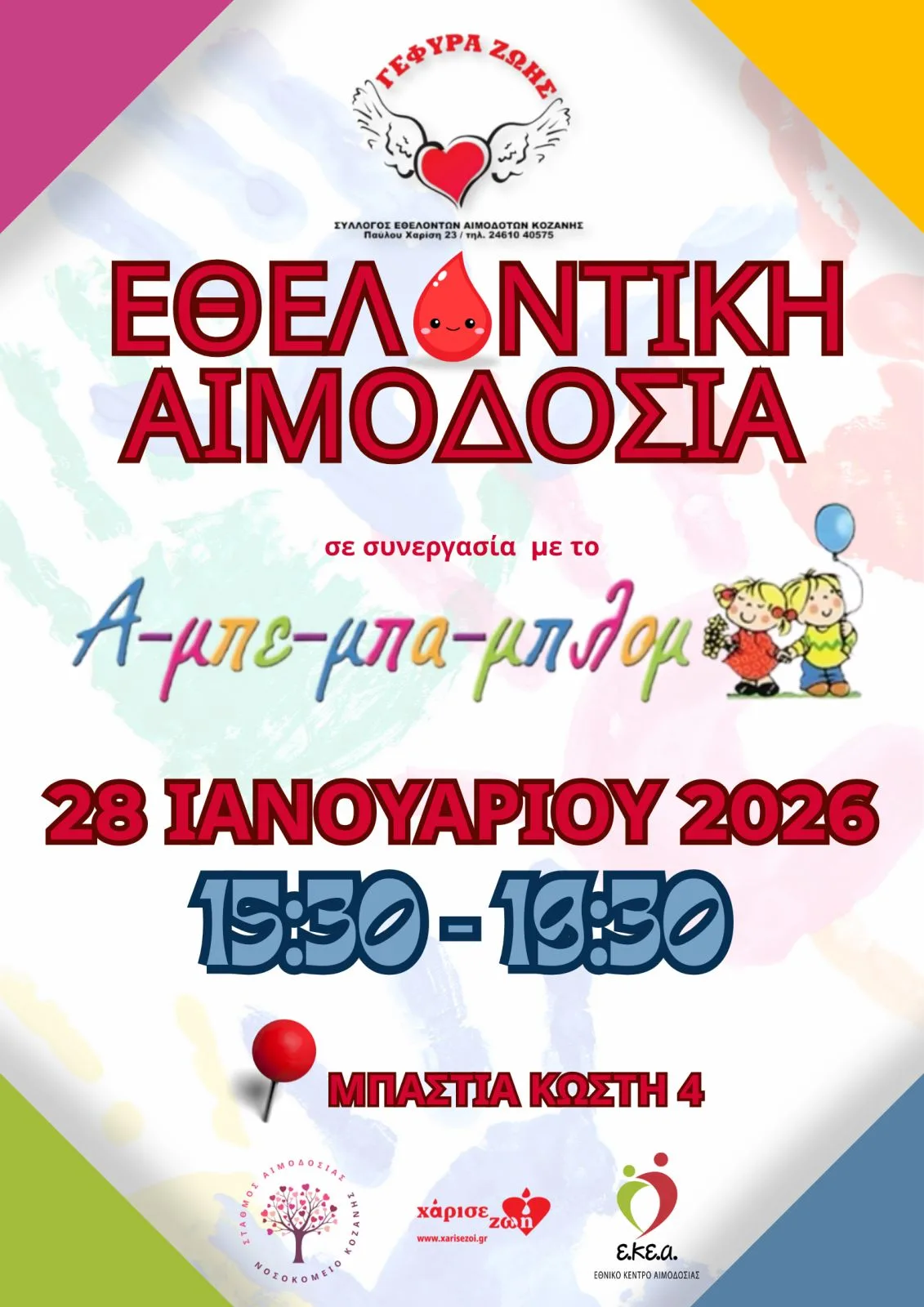 Την Τετάρτη 28 Ιανουαρίου 2026, από τις 15:30 έως τις 19:30, ο Σύλλογος Εθελοντών Αιμοδοτών Κοζάνης «Γέφυρα Ζωής» πραγματοποιεί την 3η εθελοντική αιμοδοσία για το νέο έτος, καλώντας τους πολίτες να στηρίξουν έμπρακτα τις αυξημένες ανάγκες σε αίμα. Η αιμοδοσία θα φιλοξενηθεί στις εγκαταστάσεις του Α-ΜΠΕ-ΜΠΑ-ΜΠΛΟΜ! (Βρεφονηπιακός Σταθμός – Νηπιαγωγείο – Κ.Δ.Α.Π), στην οδό Κωστή Μπαστιά 4, σε συνεργασία με το Τμήμα Αιμοδοσίας του «Μαμάτσειου» Γενικού Νοσοκομείου Κοζάνης.