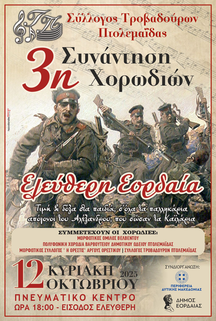 Ο Σύλλογος Τροβαδούρων Πτολεμαΐδας σας προσκαλεί στην 3η Συνάντηση χορωδιών ¨Ελεύθερη Εορδαία” η οποία εντάσσεται στις εκδηλώσεις για τα Ελευθέρια της Πτολεμαΐδας από τον Τουρκικό ζυγό.