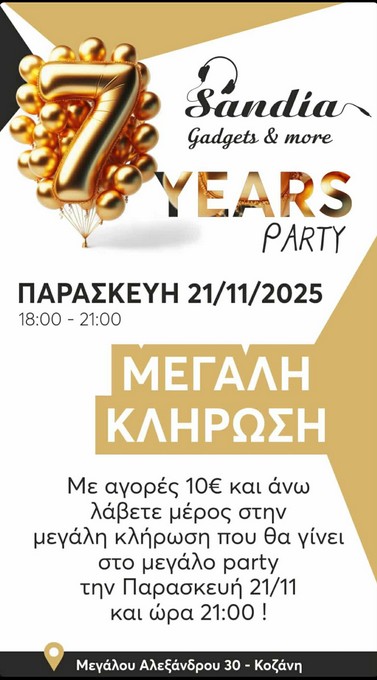 Με ένα μεγάλο πάρτι θα γιορτάσει τα 7 χρόνια λειτουργίας του το κατάστημα Sandia στην Κοζάνη. Την Παρασκευή 21/11 και ώρα 18:00-21:00 στο κατάστημα της Sandia στην οδό Μεγάλου Αλεξάνδρου 30 στην Κοζάνη θα γιορτάζει με πολλές εκπλήξεις!