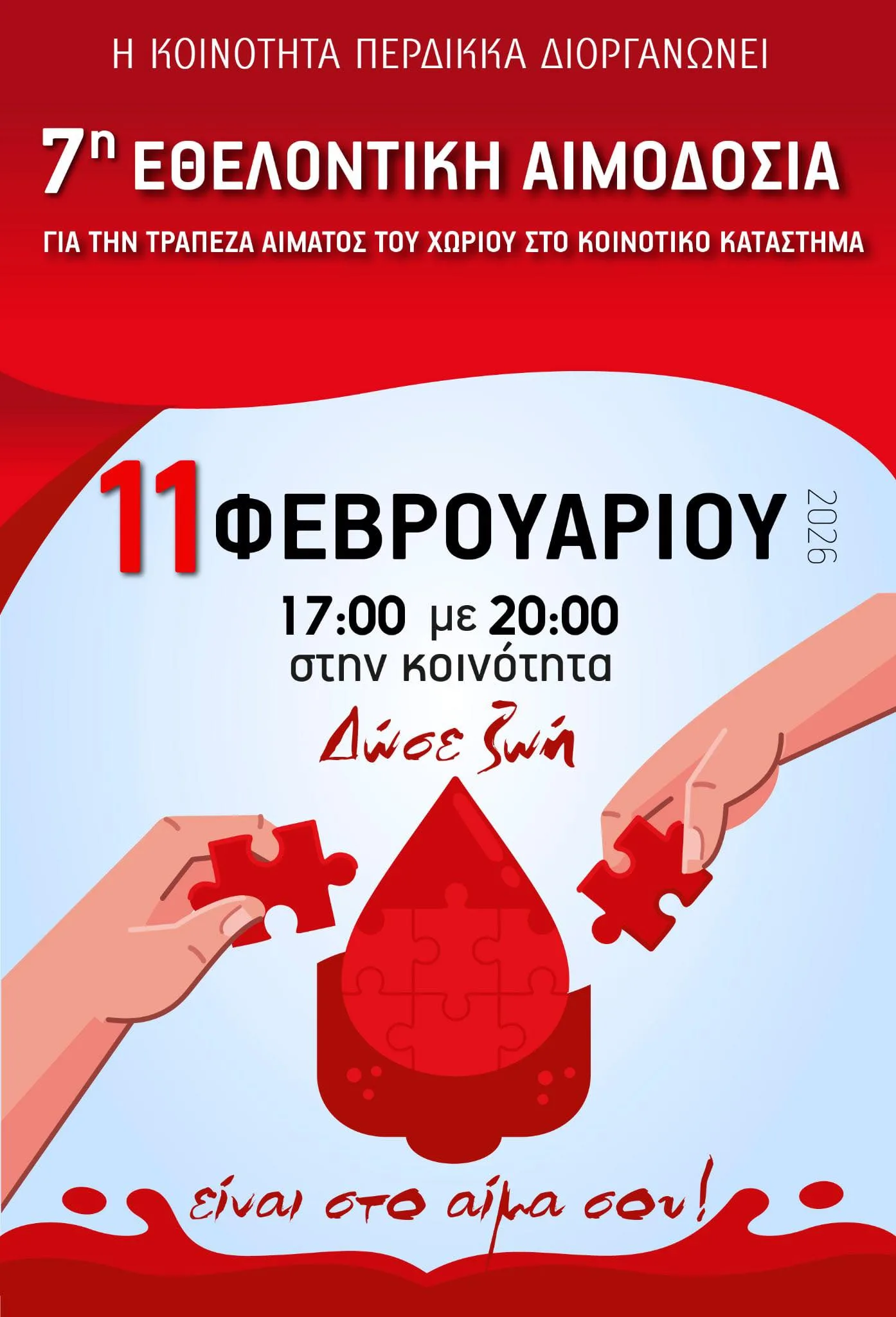 Πιστοί στο καθιερωμένο ραντεβού η Κοινότητα Περδίκκα διοργανώνει την 7η κατά σειρά εθελοντική αιμοδοσία στην κοινότητα και αναφέρει στο μήνυμά της: