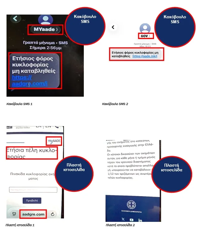 Τα μηνύματα αυτά, με την πρόφαση «μη καταβληθέντος ετήσιου φόρου κυκλοφορίας», ζητούν από τους παραλήπτες να πατήσουν σε σύνδεσμο (link) για να πληρώσουν δήθεν τέλη κυκλοφορίας οχημάτων.