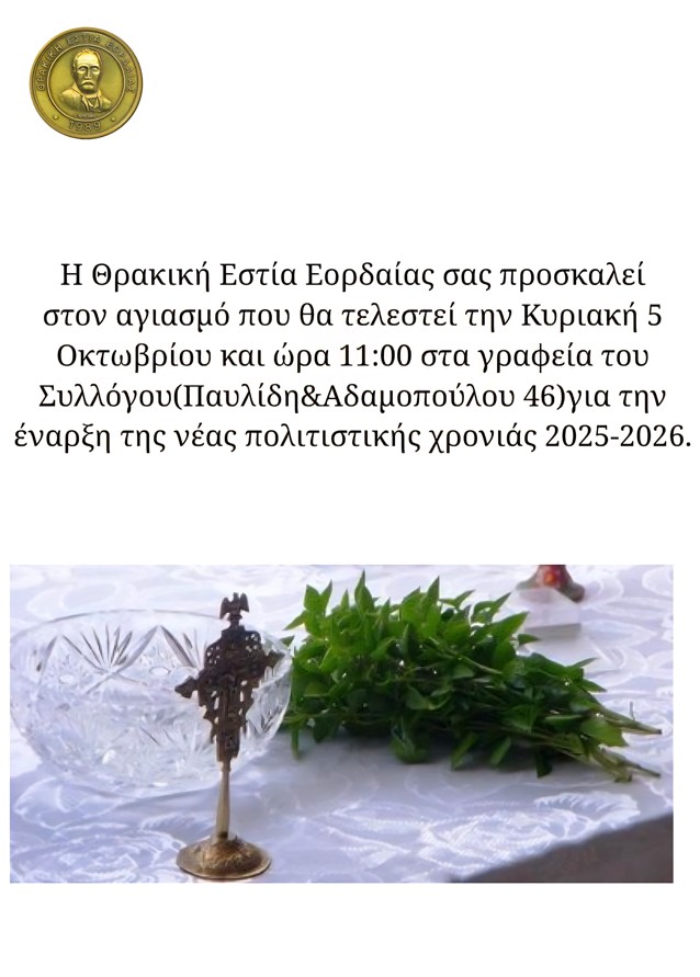 Η Θρακική Εστία Εορδαίας σας προσκαλεί στον αγιασμό που θα τελεστεί την Κυριακή 5 Οκτωβρίου και ώρα 11:00 στα γραφεία του Συλλόγου (Παυλίδη & Αδαμοπούλου 46) για την έναρξη της νέας πολιτιστικής χρονιάς 2025-2026.