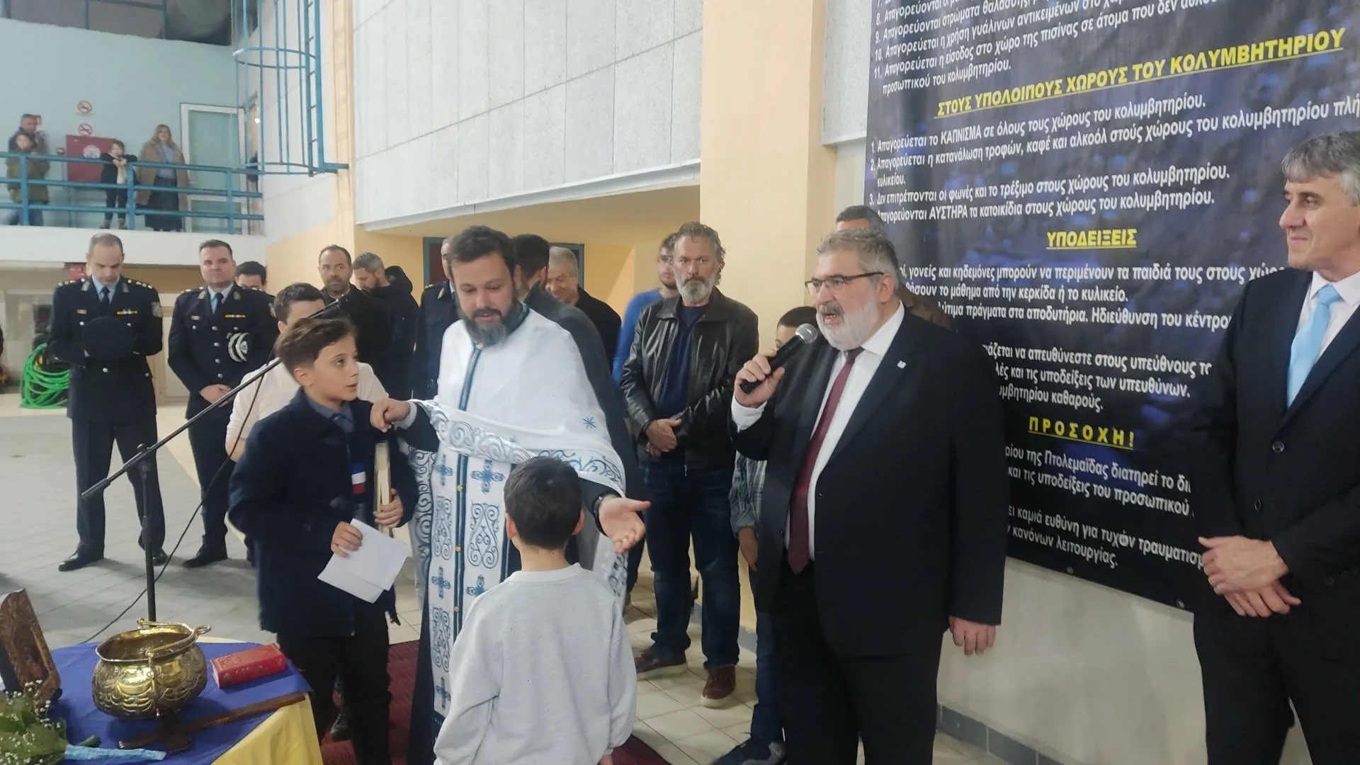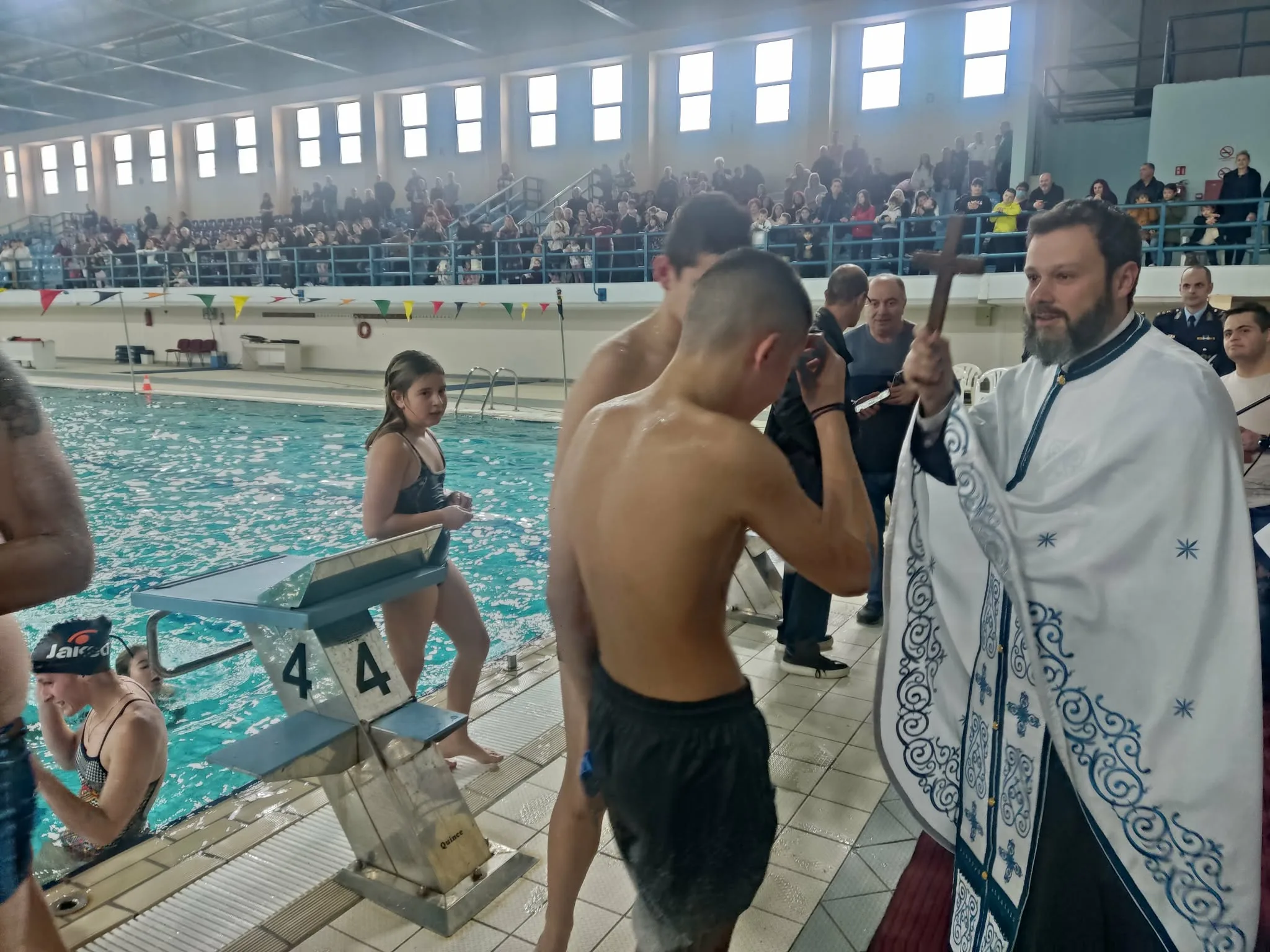 Τελέσθηκε το πρωί της Τρίτης ο καθαγιασμός των υδάτων για τον εορτασμό των Θεοφανείων στο Κολυμβητήριο Πτολεμαΐδας, παρουσία πλήθους κόσμου, αιρετών του α’ και β’ βαθμού της αυτοδιοίκησης και εκπροσώπων συλλόγων και φορέων της πόλης. Ο πάτερ Ιωάννης Τσιμπασίδης ευλόγησε τα ύδατα και έριξε τον Τίμιο Σταυρό, όπου 2 κορίτσια κατάφεραν να τον πιάσουν. Ο Δήμαρχος Εορδαίας Παναγιώτης Πλακεντάς ευχήθηκε καλή χρονιά και καλή φώτιση σε όλους και δώρισε από ένα σταυρό στα κορίτσια.