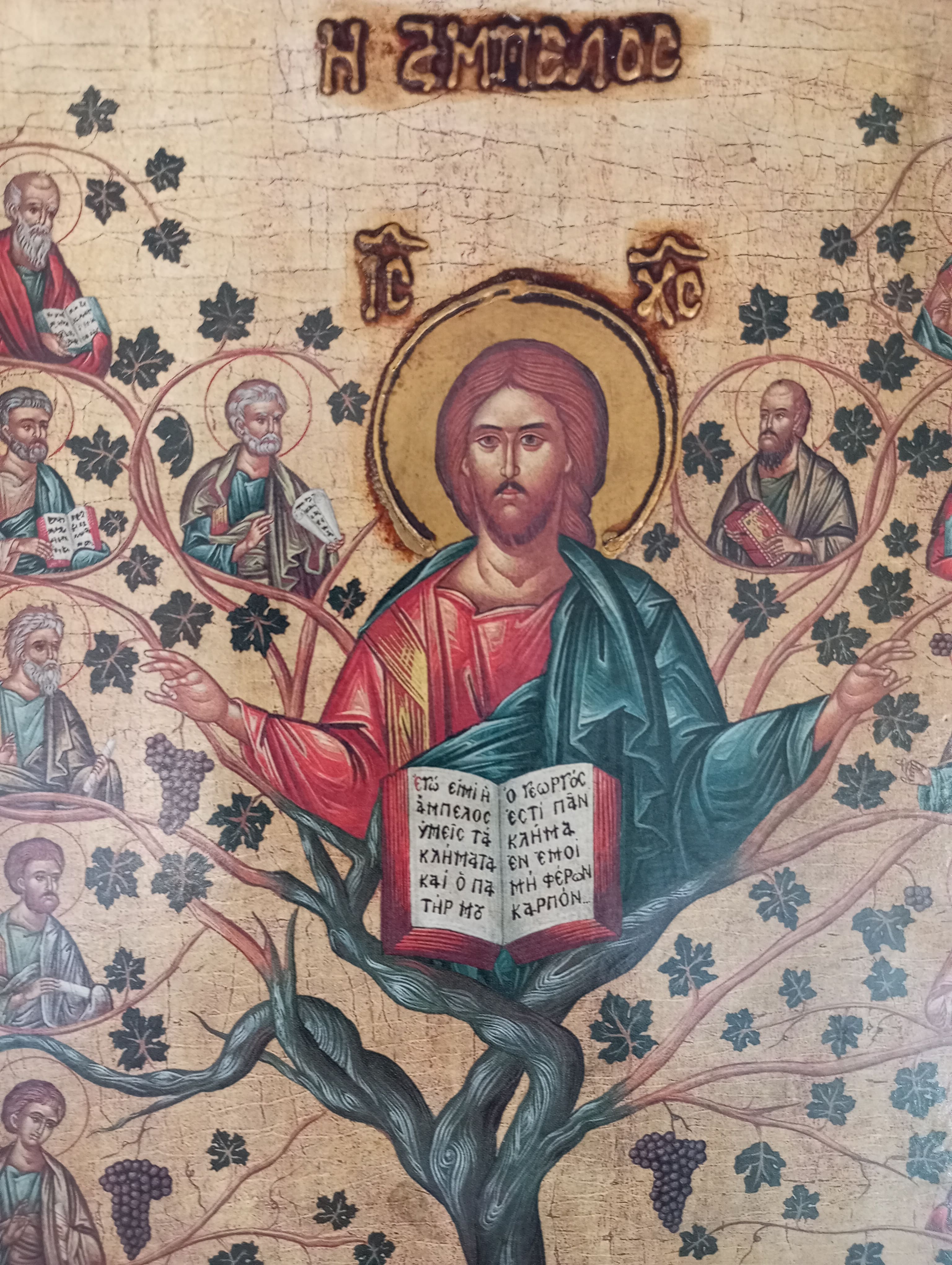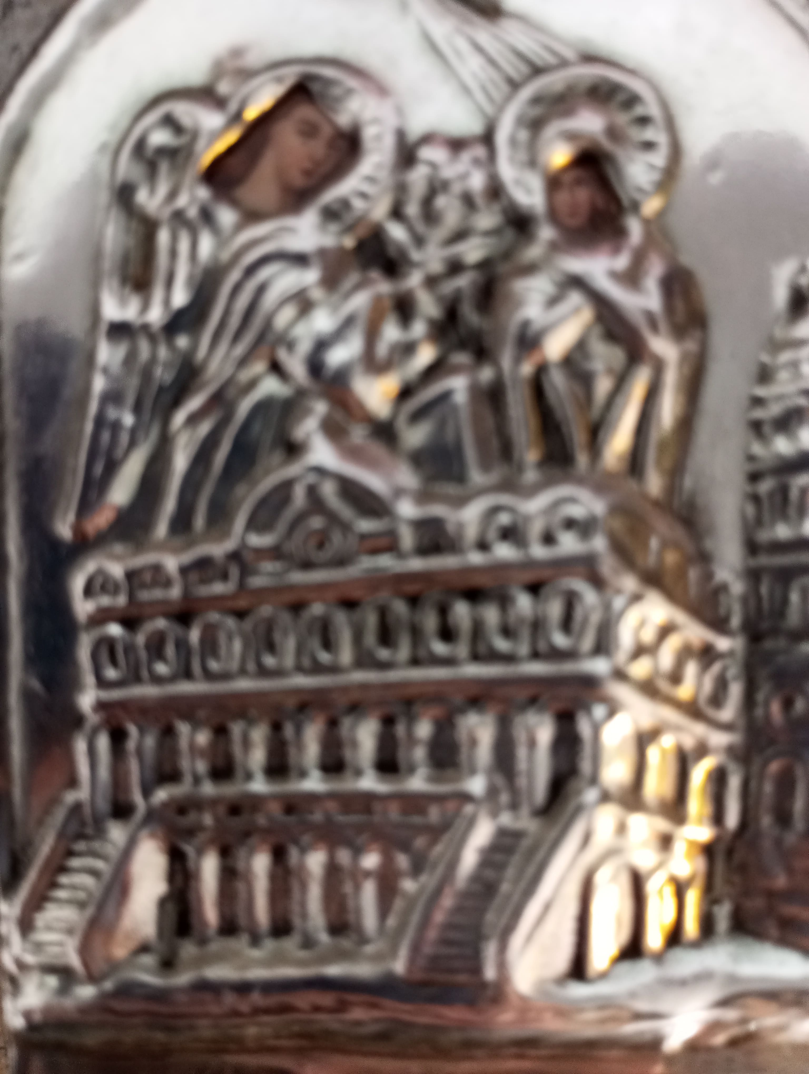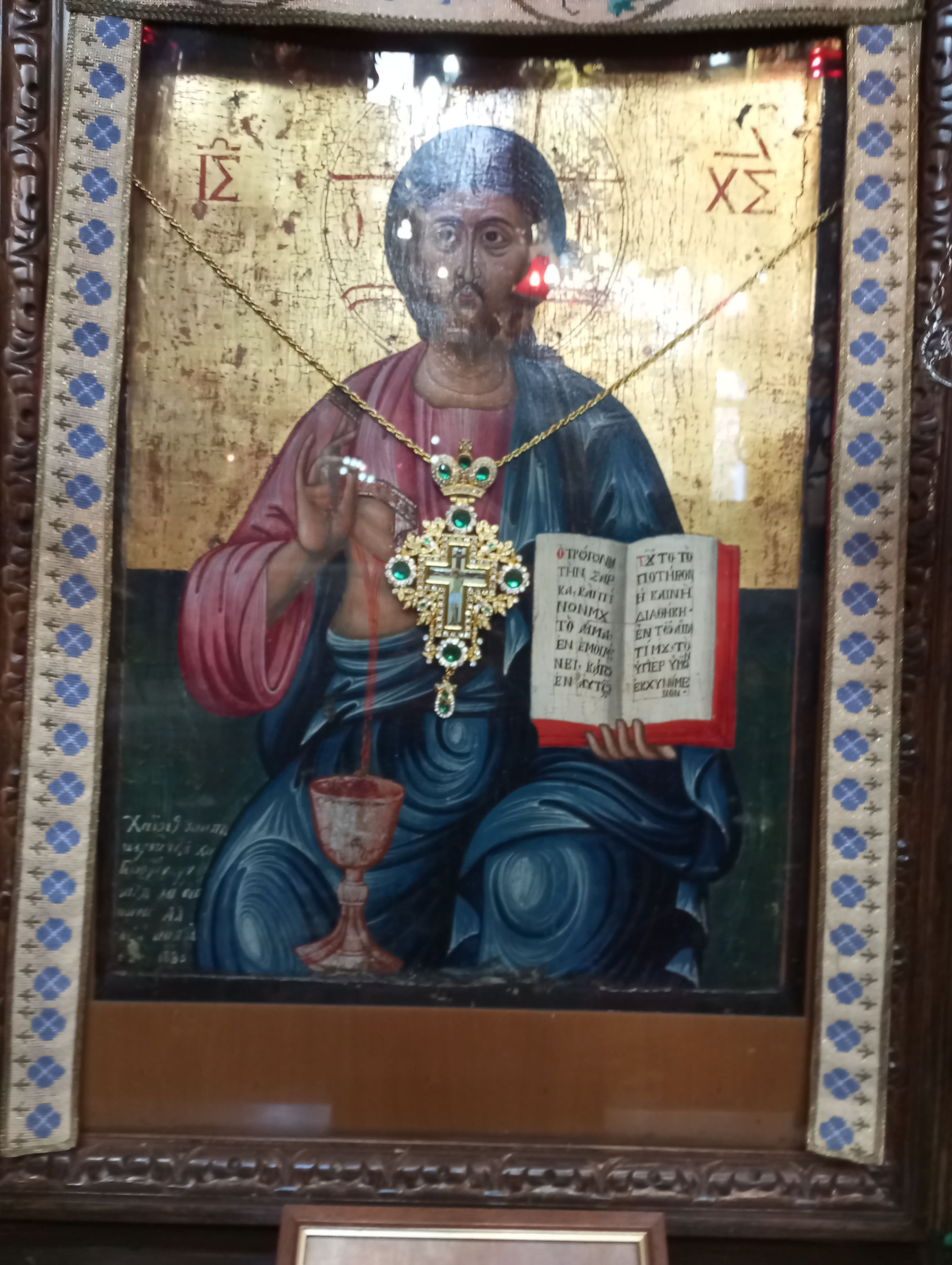 (=Απέναντι από την εικόνα σου, Παναγία Χρυσοπηγή, υπάρχει εικόνα του Χριστού, στην οποία φαίνεται ( από το εκ λόγχης τραύμα του) το αίμα να χύνεται στο Άγιο Δισκοπότηρο. Το Άγιο Δισκοπότηρο : Δισκοποτήριον, εις τα μεσαιωνικά χρόνια.