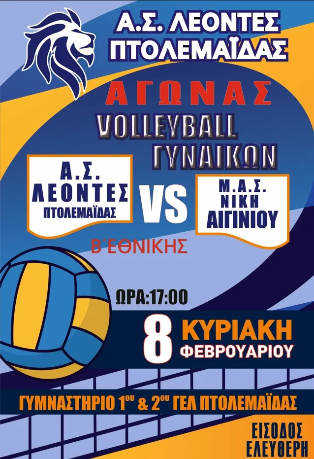 Το Μ.Α.Σ. ΝΙΚΗ Αιγινίου θα κληθούν να αντιμετωπίσουν οι γυναίκες της Β’ Εθνικής του Α.Σ. ΛΕΟΝΤΕΣ Πτολεμαΐδας την Κυριακή και ώρα 17:00 στο Γυμναστήριο του 1ου&2ου ΓΕΛ Πτολεμαΐδας. Η είσοδος είναι ελεύθερη για το κοινό.
