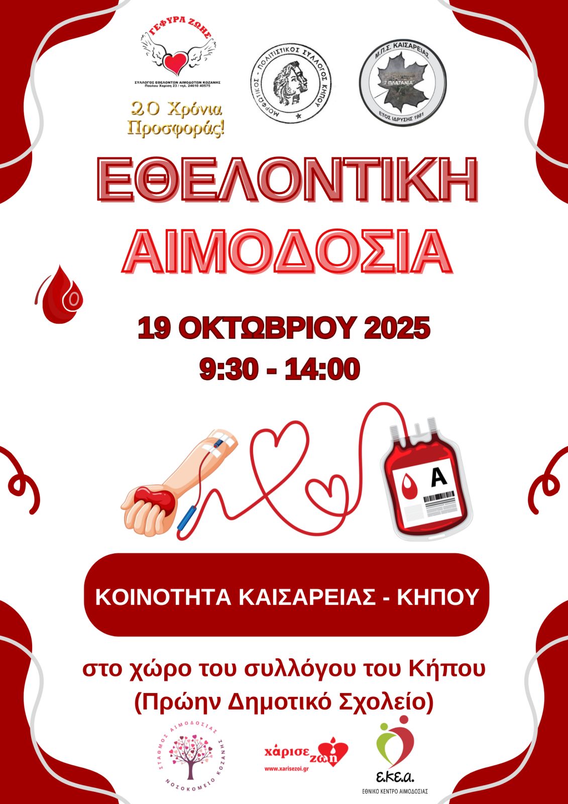 Η επόμενη εθελοντική αιμοδοσία της “ΓΕΦΥΡΑΣ ΖΩΗΣ” θα πραγματοποιηθεί στο Πνευματικό Κέντρο (πρώην Δημοτικό Σχολείο) του Τ.Δ. Κήπου, την Κυριακή 19 Οκτωβρίου 2025, από τις 09:30 έως τις 14:00. Η διοργάνωση αποτελεί συνεργασία των Μορφωτικών –Πολιτιστικών Συλλόγων Καισαρειάς – Κήπου, της κοινότητας του Δ.Δ.ΚΑΙΣΑΡΕΙΑΣ – ΚΗΠΟΥ και του τμήματος Αιμοδοσίας του Γ.Ν. Κοζάνης.