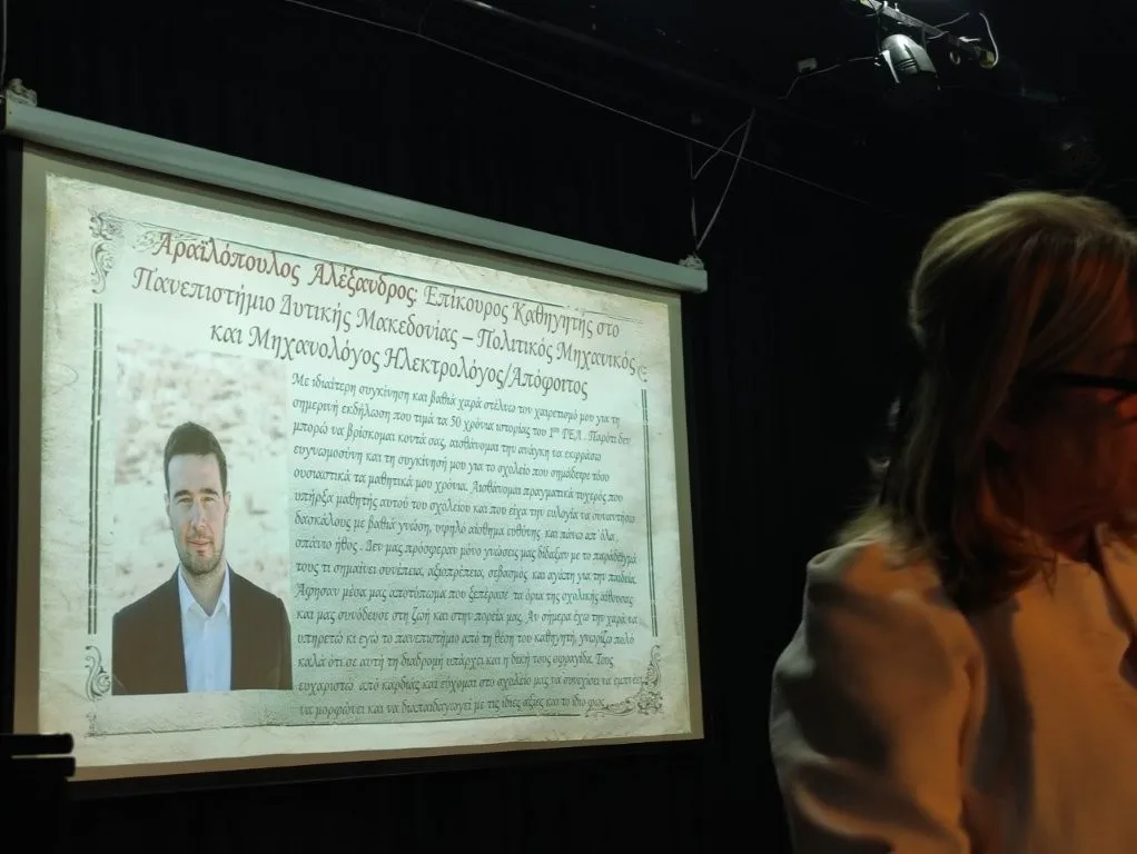 Με έντονη συγκίνηση, αναφορές στην ιστορική διαδρομή του σχολείου και τιμητική διάκριση στον πρώην διευθυντή Γρηγόρη Πουγαρίδη, πραγματοποιήθηκε σήμερα στο Πνευματικό Κέντρο Πτολεμαΐδας η εκδήλωση του 1ου ΓΕΛ Πτολεμαΐδας με τίτλο «50 χρόνια Λύκειο – 50 χρόνια 1ο Λύκειο». Μαθητές, εκπαιδευτικοί, απόφοιτοι και εκπρόσωποι της Εκκλησίας και της τοπικής κοινωνίας συμμετείχαν σε μια εκδήλωση που επιχείρησε να συνδέσει το παρελθόν του σχολείου με τη σημερινή του παρουσία.