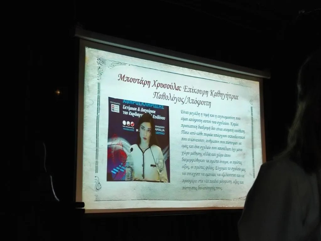 Στις δικές του αναμνήσεις αναφέρθηκε και ο πατήρ Ιωάννης Εσπερίδης, απόφοιτος του σχολείου, τονίζοντας ότι τα μαθητικά χρόνια παραμένουν φορτωμένα με μνήμες, συναισθήματα και πρόσωπα που διαμορφώνουν την πορεία ενός ανθρώπου. Από την πλευρά της, η φιλόλογος και υποδιευθύντρια Ολυμπία Μητσιάδου μίλησε με θέμα «Από το θρανίο στην έδρα», αναδεικνύοντας τη δική της διαδρομή από μαθήτρια του σχολείου σε εκπαιδευτικό.