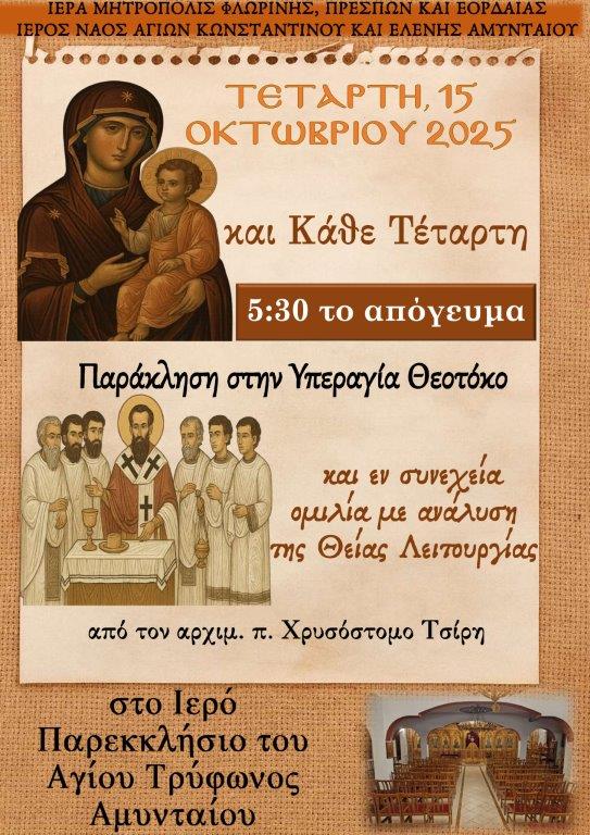 Από την Τετάρτη 15 Οκτωβρίου 2025 και κάθε εβδομάδα, ο Ιερός Ναός Αγίων Κωνσταντίνου και Ελένης Αμυνταίου, στο πλαίσιο της πνευματικής μέριμνας της Ιεράς Μητρόπολης Φλωρίνης, Πρεσπών και Εορδαίας, πραγματοποιεί Παράκληση στην Υπεραγία Θεοτόκο στις 5:30 το απόγευμα.
