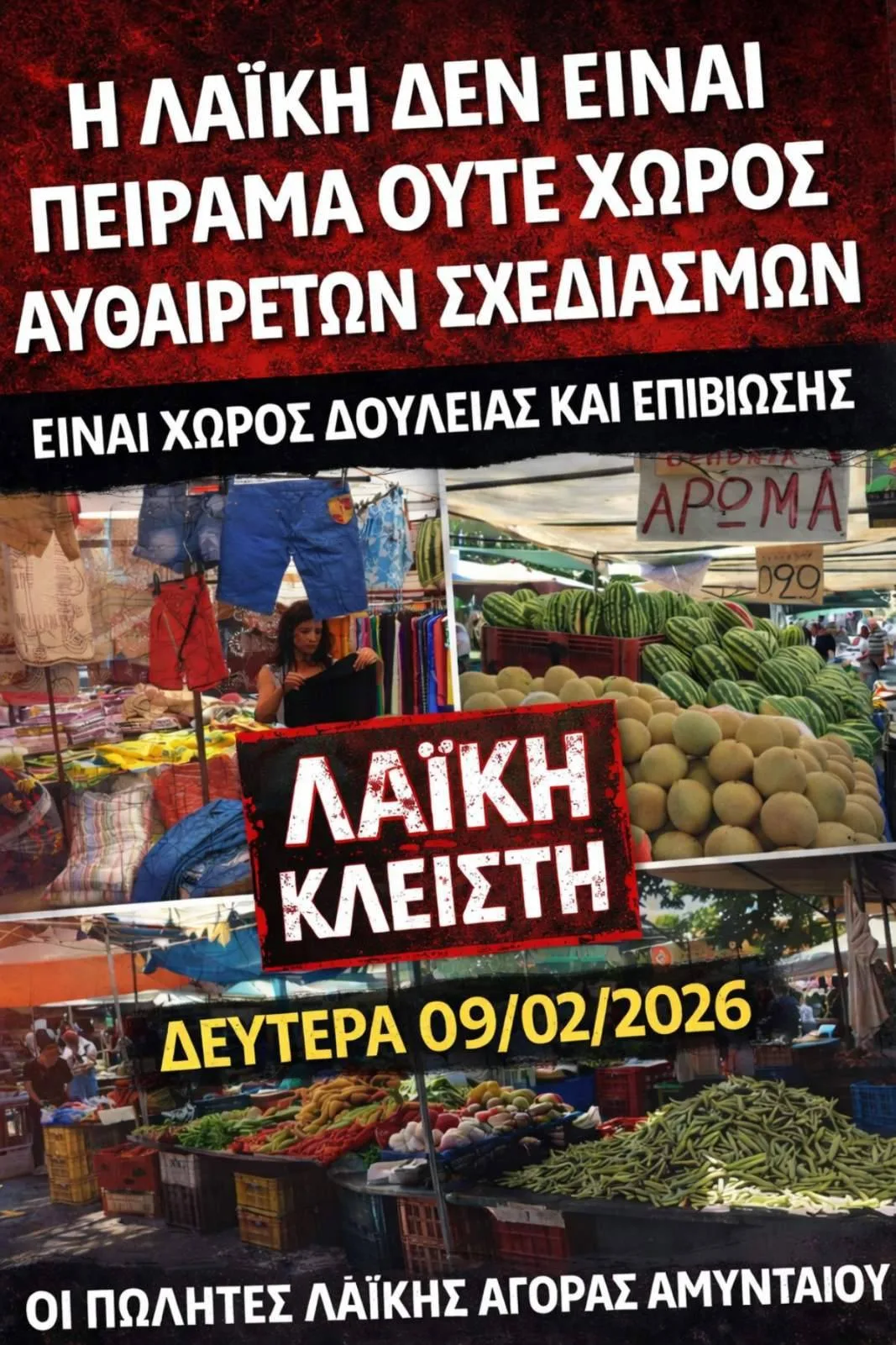 Ωστόσο οι πωλητές της λαϊκής αγοράς του Αμυνταίου εκφράζουν αντιδράσεις, κυκλοφορώντας μάλιστα και μια αφίσα στην οποία αναγράφεται το σύνθημα: «Η λαϊκή δεν είναι πείραμα, είτε χώρος αυθαίρετων σχεδιασμών, είναι χώρος δουλειάς και επιβίωσης», τονίζοντας πως τη Δευτέρα 9 Φεβρουαρίου η λαϊκή αγορά θα είναι κλειστή, σε ένδειξη διαμαρτυρίας για την «αιφνιδιαστική και αυθαίρετη» όπως καταγγέλλουν απόφαση της δημοτικής αρχής να μεταφέρουν τη λαϊκή σε ακατάλληλο χώρο. Την ανακοίνωση συνυπογράφει η Ομοσπονδία πωλητών λαϊκών αγορών Δ. Μακεδονίας «Μέγας Αλέξανδρος».