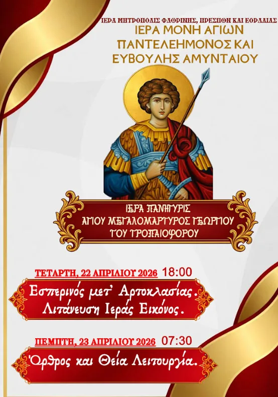 Με εκκλησιαστική κατάνυξη θα πραγματοποιηθεί στο Αμύνταιο η Ιερά Πανήγυρις του Αγίου Μεγαλομάρτυρος Γεωργίου, στην Ιερά Μονή Αγίων Παντελεήμονος και Ευβούλης.