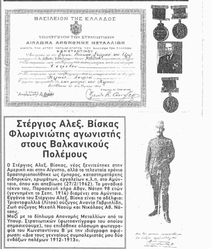 Ο Στέργιος Βίσκας διακρίθηκε στην μάχη του Οστρόβου (Άρνισσας) στις 14 Νοεμβρίου 1912. τιμήθηκε με το μετάλλιο ανδρείας και ο Βασιλεύς Κωνσταντίνος Β’ του απέστειλε ολόσωμη φωτογραφία με ιδιόγραφη αφιέρωση!