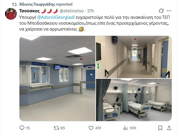 Υπουργέ @AdonisGeorgiadi ευχαριστούμε πολύ για την ανακαίνιση του ΤΕΠ του Μποδοσάκειου νοσοκομείου,όπως είπε ένας προσερχόμενος γέροντας, να χαίρεσαι να αρρωσταίνεις 🤣. pic.twitter.com/hzjG3Px8Re