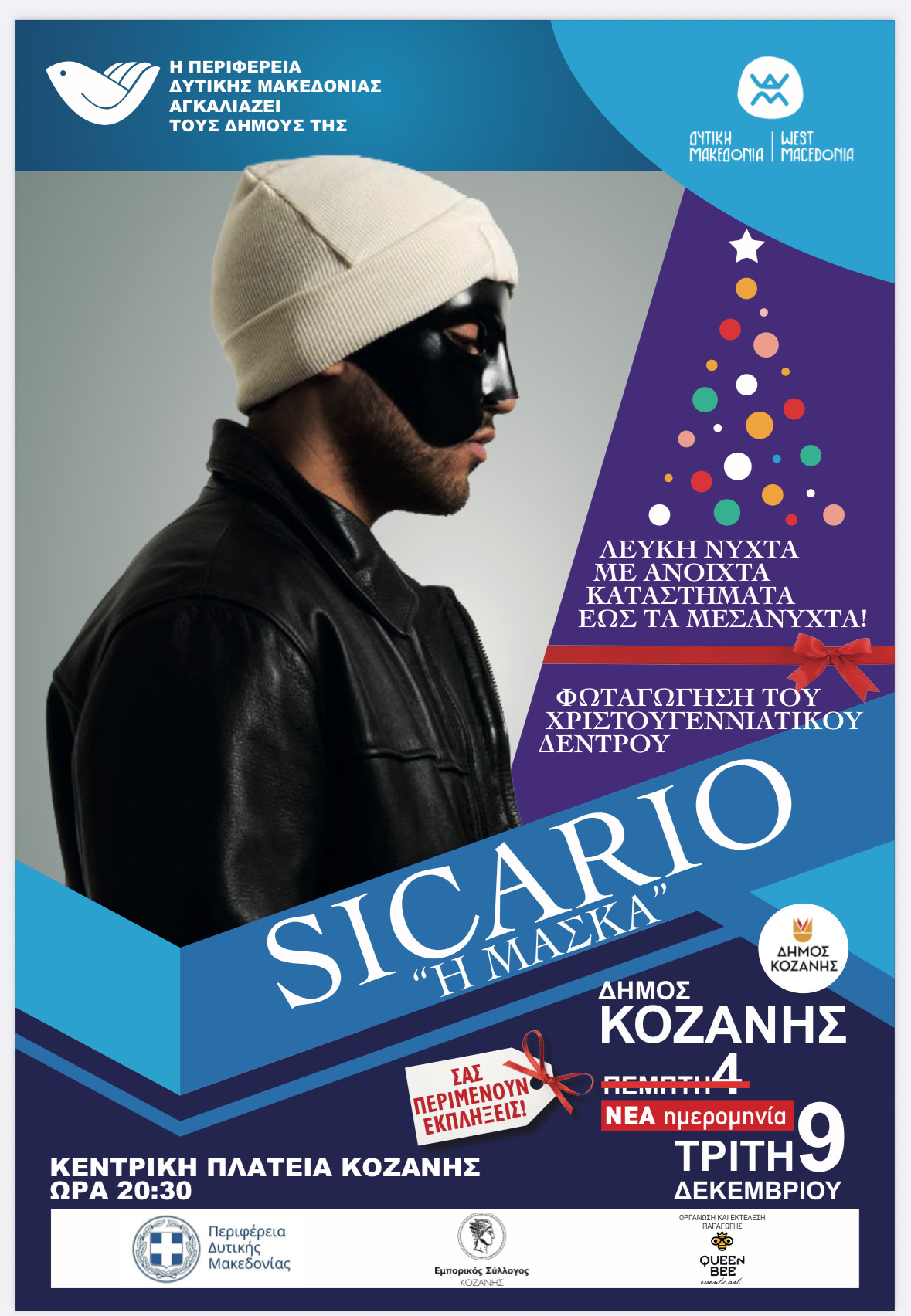 Λόγω των δυσμενών καιρικών συνθηκών που προβλέπεται ότι θα επικρατούν το βράδυ της Πέμπτης 4 Δεκεμβρίου 2025, η εκδήλωση φωταγώγησης του Χριστουγεννιάτικου Δέντρου με τον Sicario και τη Φιλαρμονική του Δήμου Κοζάνης «ΠΑΝΔΩΡΑ» στην κεντρική πλατεία Νίκης, μαζί με την ταυτόχρονη διοργάνωση «Λευκής Νύχτας» στην αγορά από τον Εμπορικό Σύλλογο Κοζάνης, αναβάλλονται και μετατοπίζονται χρονικά για το βράδυ της Τρίτης 9 Δεκεμβρίου 2025 και ώρα 20:30.
