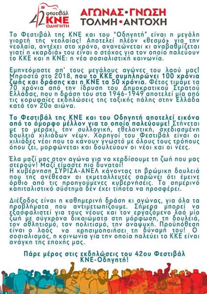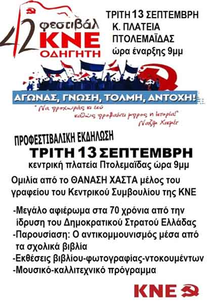 Μεταφέρονται λόγω καιρού οι εκδηλώσεις του 42ου Φεστιβάλ ΚΝΕ-Οδηγητή στην Πτολεμαΐδα, που επρόκειτο να πραγματοποιηθούν αύριο Τρίτη 6 Σεπτεμβρίου στις 9 το βράδυ στην Κεντρική πλατεία της Πτολεμαΐδας.