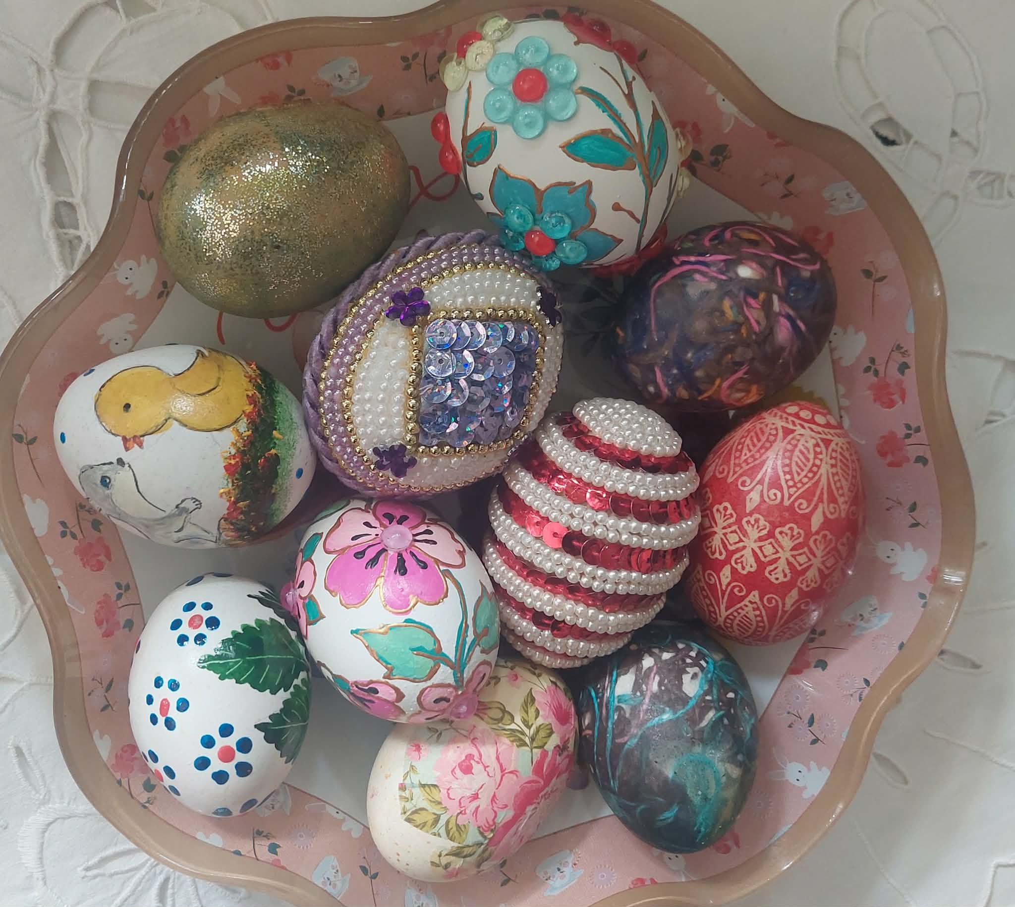 Με ένα κόκκινο πανί απλωμένο στο μπαλκόνι μας , που συμβολίζει το αίμα του Χριστού , από το πρωί της Μεγάλης Πέμπτης ξεκινήσαμε και το βάψιμο των κόκκινων αυγών , μόνο που στις ημέρες μας τα αυγά δεν είναι μόνο κόκκινα, είναι κίτρινα, πράσινα , μπλε , χρυσαφιά και πολύχρωμα στολισμένα με σχέδια που τα κάνουν κάποια από αυτά να μοιάζουν με έργα τέχνης ! Στην όλη διαδικασία ακολουθώντας την παράδοση συμμετέχουν και τα μικρά παιδιά ζωγραφίζοντας ή τοποθετώντας πασχαλινές χαλκομανίες, στα φρεσκοβρασμένα αυγά!