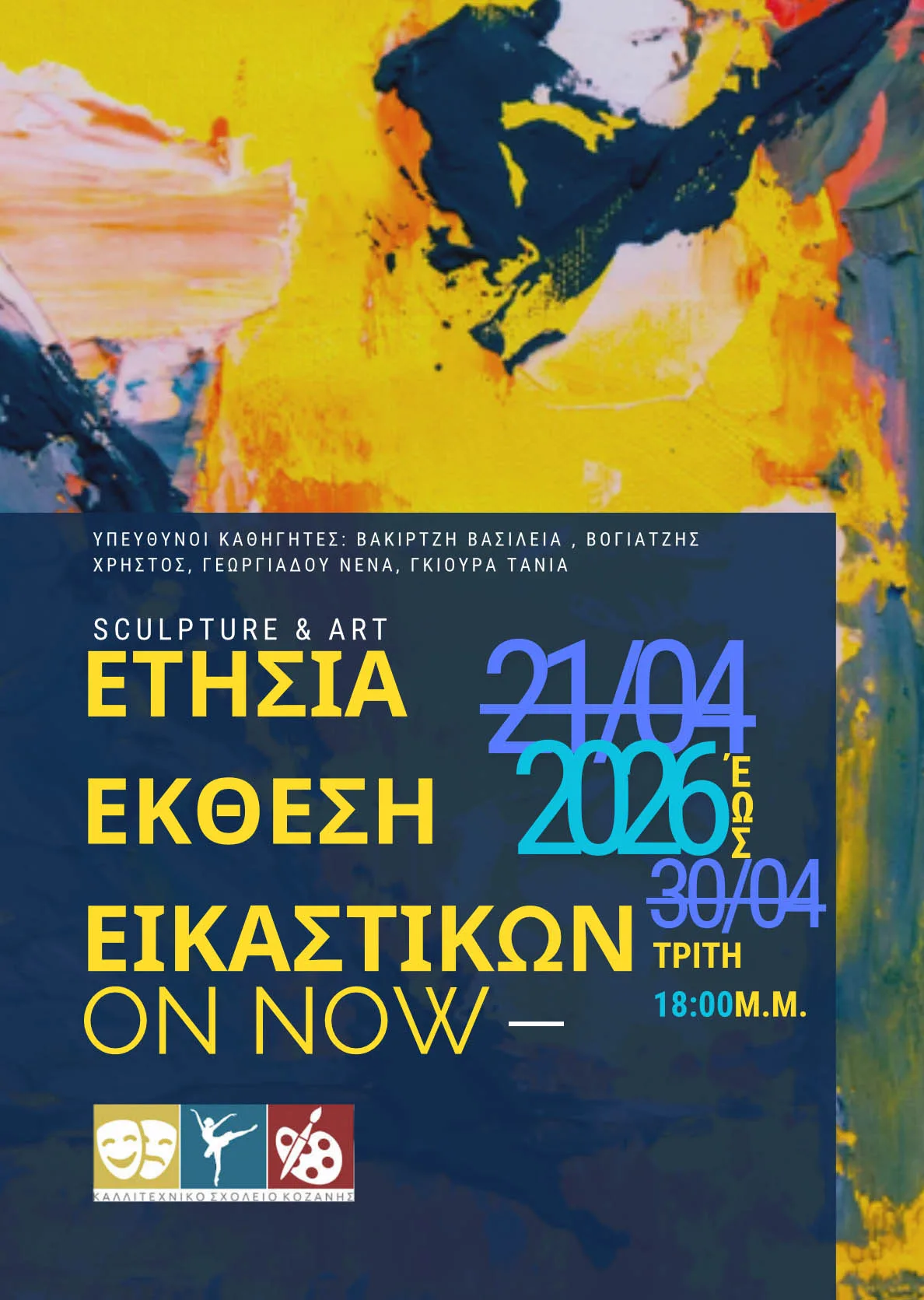 Υπεύθυνοι καθηγητές είναι οι Βακιρτζή Βασίλεια, Βογιατζής Χρήστος, Γεωργιάδου Νένα και Γκιούρα Τάνια. Η διοργάνωση αναμένεται να αποτελέσει ακόμη μία ευκαιρία για το κοινό της Κοζάνης να έρθει σε επαφή με τη μαθητική καλλιτεχνική δημιουργία και τη δουλειά που παράγεται στο σχολείο.