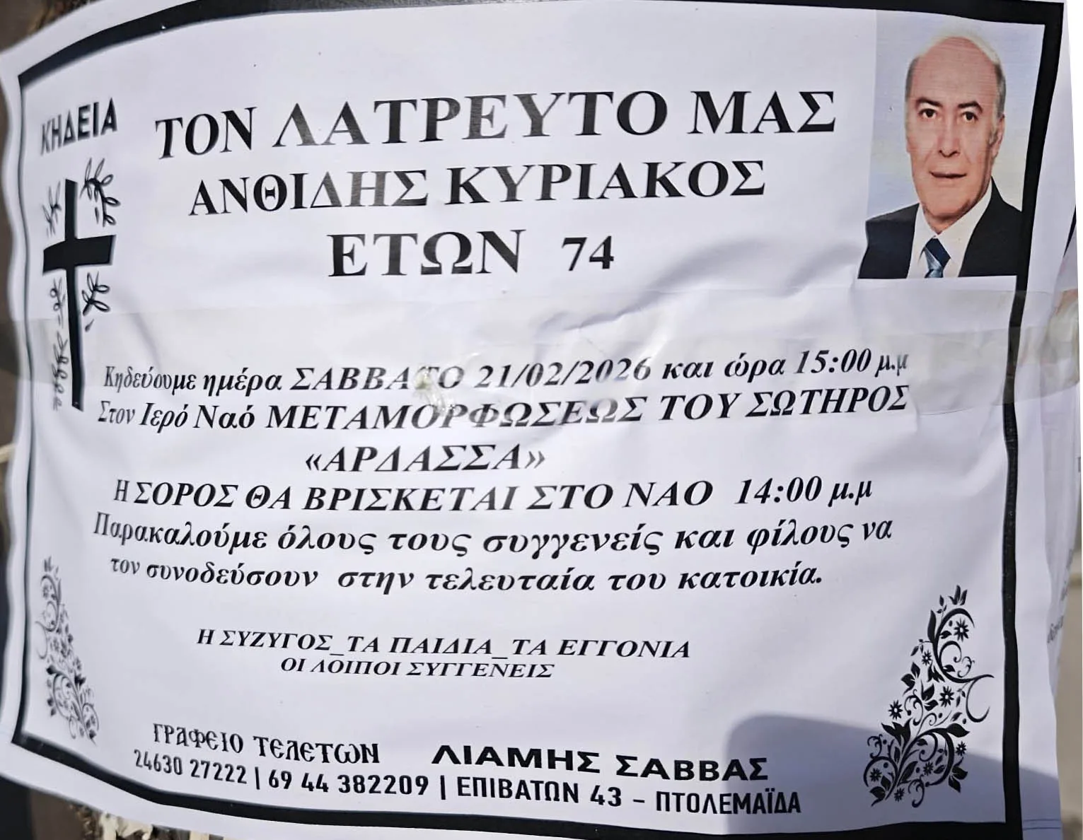 Η κηδεία θα γίνει σήμερα Σάββατο 21 Φεβρουαρίου στο Ιερό Ναό Μεταμορφώσεως του Σωτήρος στην Άρδασσα Εορδαίας.