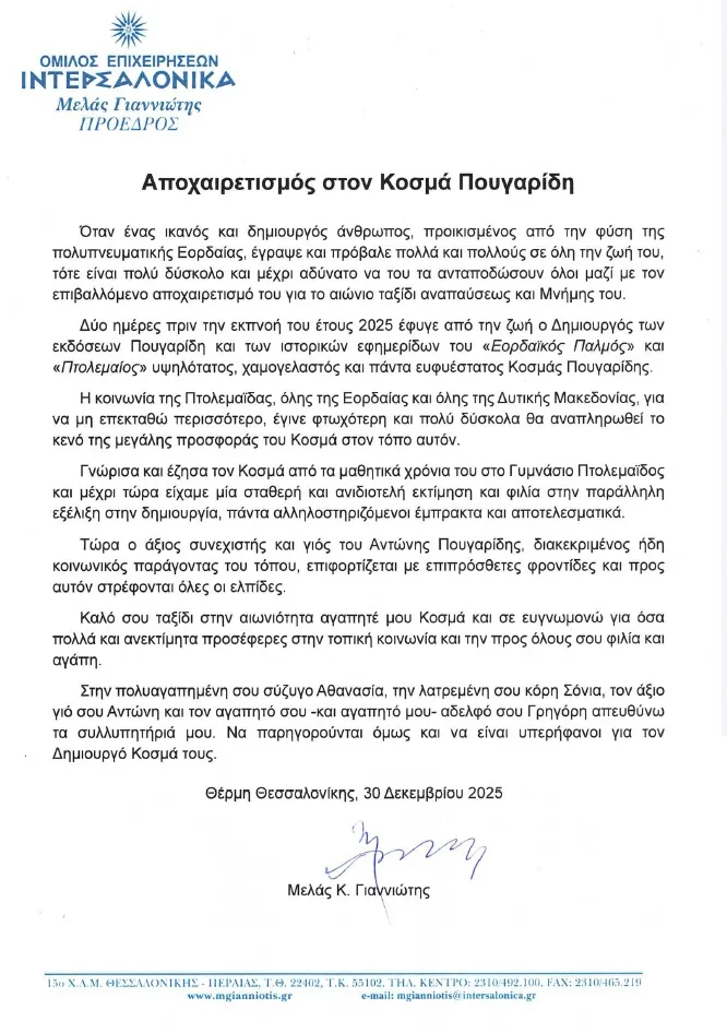 Με λόγια βαθιάς εκτίμησης και προσωπικής συγκίνησης, ο Μελάς Γιαννιώτης, πρόεδρος του Ομίλου Ιντερσαλόνικα, αποχαιρετά τον Κοσμά Πουγαρίδη, κάνοντας αναδρομή στη μακρόχρονη φιλία τους και αναγνωρίζοντας την πολύπλευρη προσφορά του στην Εορδαία και τη Δυτική Μακεδονία.