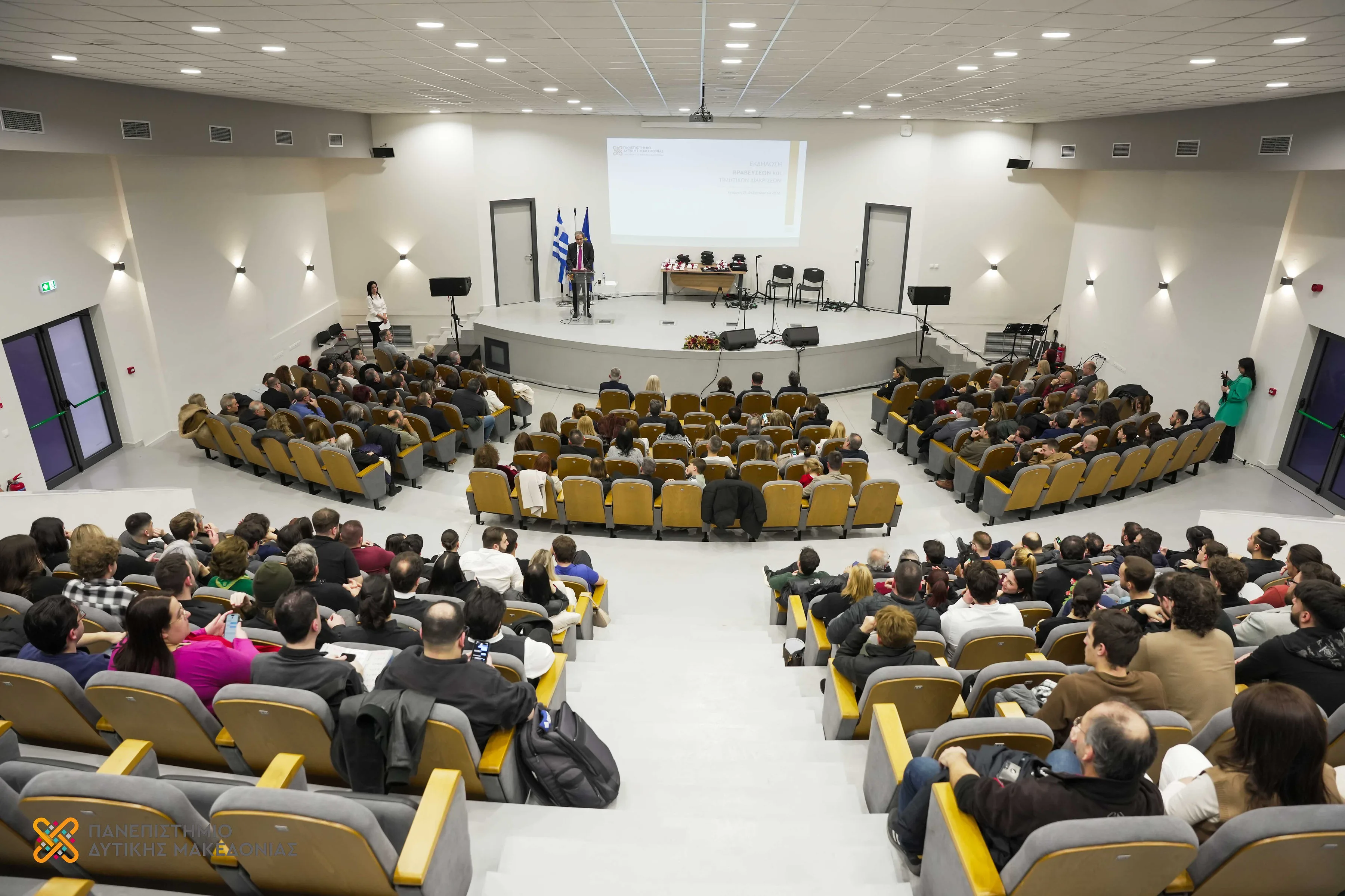 Στο Κεντρικό Αμφιθέατρο του Πανεπιστημίου Δυτικής Μακεδονίας, η ακαδημαϊκή κοινότητα συναντήθηκε για την ετήσια Τελετή Βραβεύσεων και Τιμητικών Διακρίσεων του Ιδρύματος, τιμώντας το έργο και τη συμβολή των μελών της. Η εκδήλωση ανέδειξε τη δυναμική πορεία του Πανεπιστημίου, με την έρευνα, τη διδασκαλία και τη φοιτητική δράση στον πυρήνα της ταυτότητάς του.
