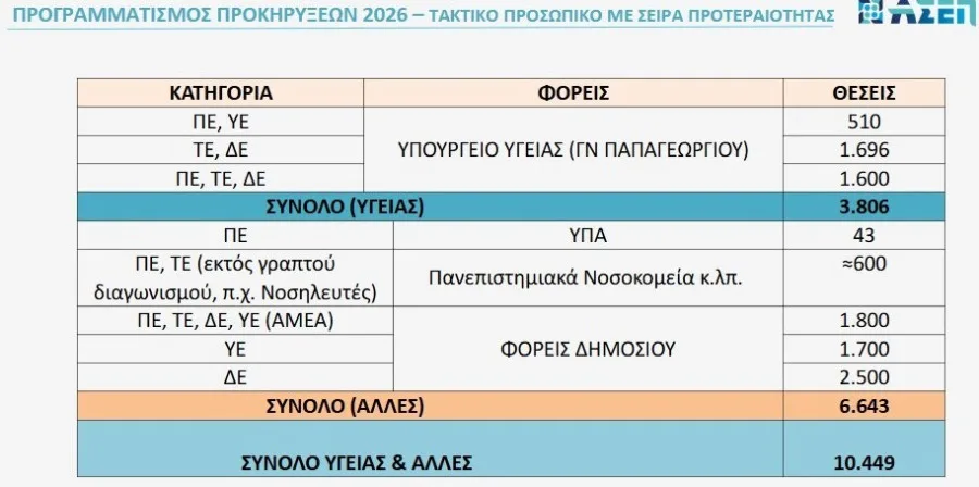 Ο συνολικός προγραμματισμός για το 2026 περιλαμβάνει 10.449 θέσεις μέσω 9 προκηρύξεων «Κ» και 6.290 θέσεις για επιτυχόντες του 2ου Πανελλήνιου Γραπτού Διαγωνισμού (1Γ/2025)