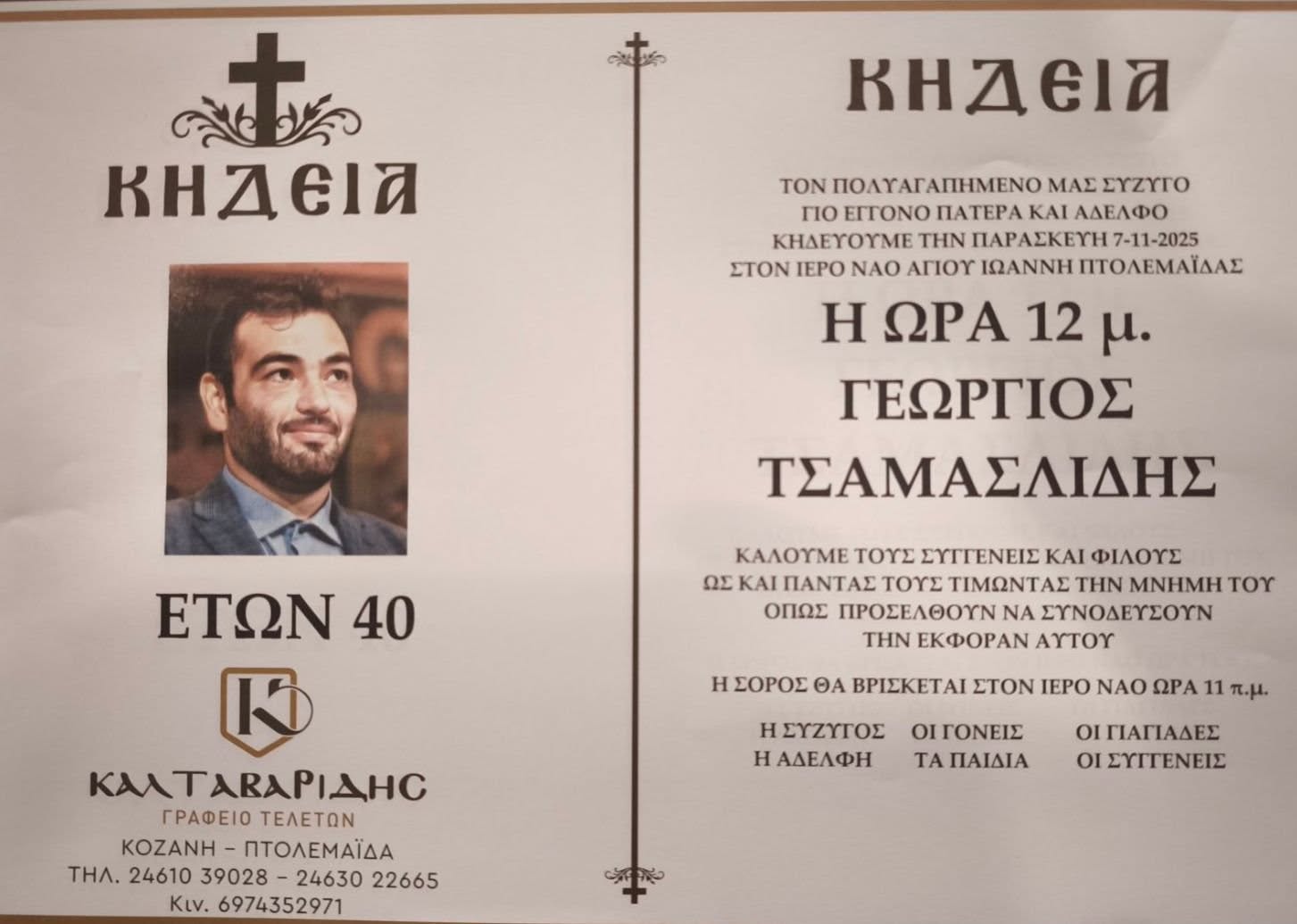 Αύριο Παρασκευή 7/11 και ώρα 12:00 στον Ι.Ν. Αγίου Ιωάννη Πτολεμαΐδας, θα τελεστεί η εξόδιος ακολουθία του 40χρονου Γεώργιου Τσαμασλίδη που έχασε τη ζωή του κατά την εργασία του σε επιχείρηση λατομείου στην Άρδασσα Εορδαίας το μεσημέρι της Τετάρτης 5/11.