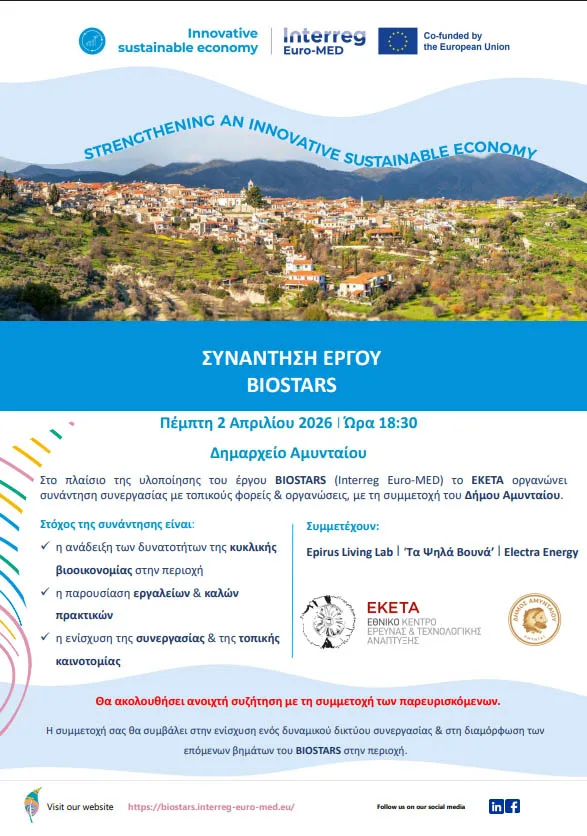 Σημείο συνάντησης για τη βιοοικονομία, τη βιώσιμη ανάπτυξη και την τοπική καινοτομία γίνεται το Αμύνταιο, με αφορμή τη διοργάνωση του 2ου BIOSTARS Hub Meeting την Πέμπτη 2 Απριλίου 2026, στις 18:30, στην Αίθουσα Δημοτικού Συμβουλίου του Δήμου Αμυνταίου. Η εκδήλωση εντάσσεται στο ευρωπαϊκό έργο BIOSTARS του προγράμματος Interreg Euro-MED και διοργανώνεται από το ΕΚΕΤΑ σε συνεργασία με τον Δήμο Αμυνταίου.