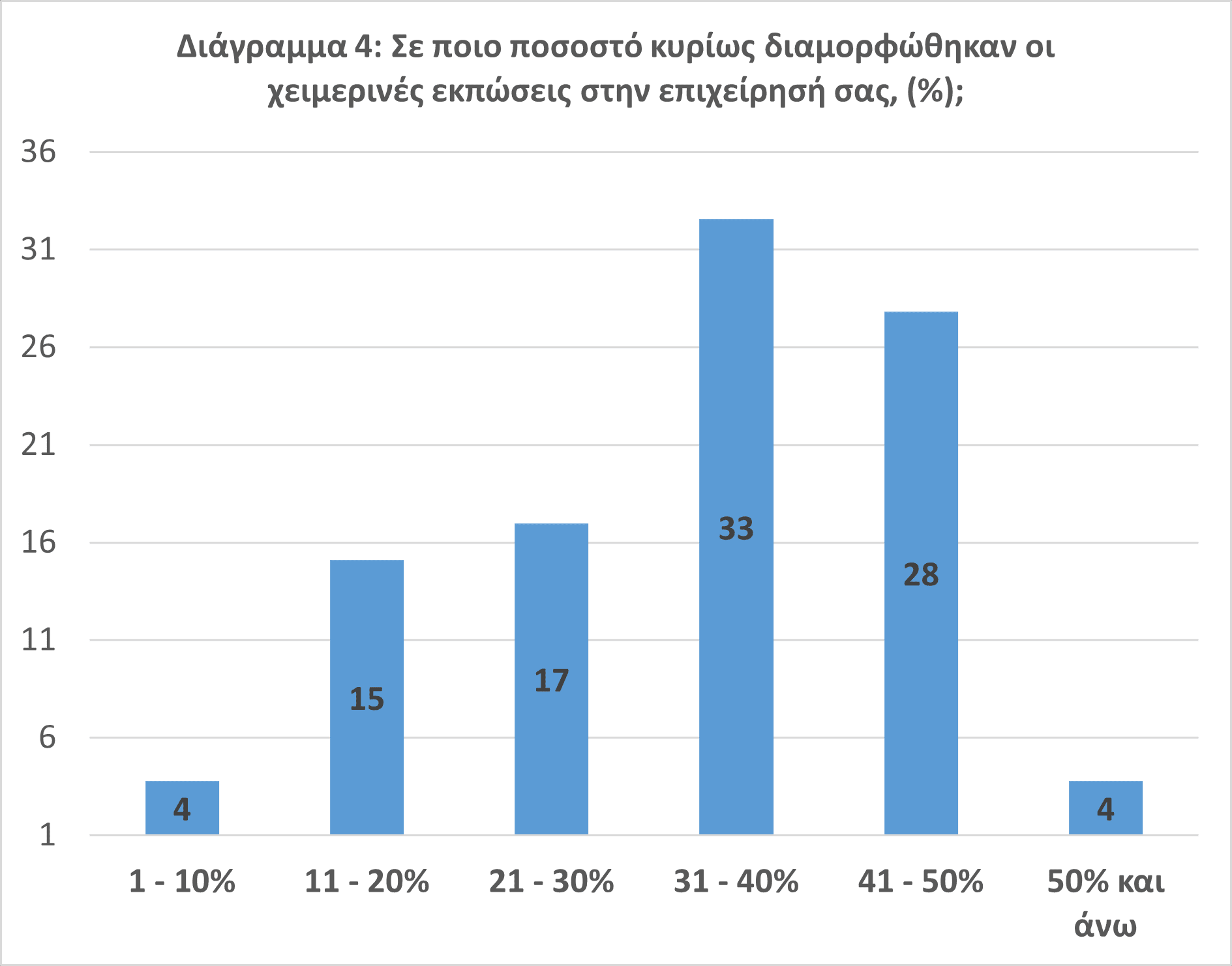 • Ενδεικτικό της στενότητας στην αγορά αλλά και της έντασης της προσπάθειας των εμπόρων να προσελκύσουν τους καταναλωτές αποτελεί το γεγονός ότι 2 στις 3 επιχειρήσεις υιοθέτησαν ποσοστά εκπτώσεων άνω του 30% (Διάγραμμα 4).