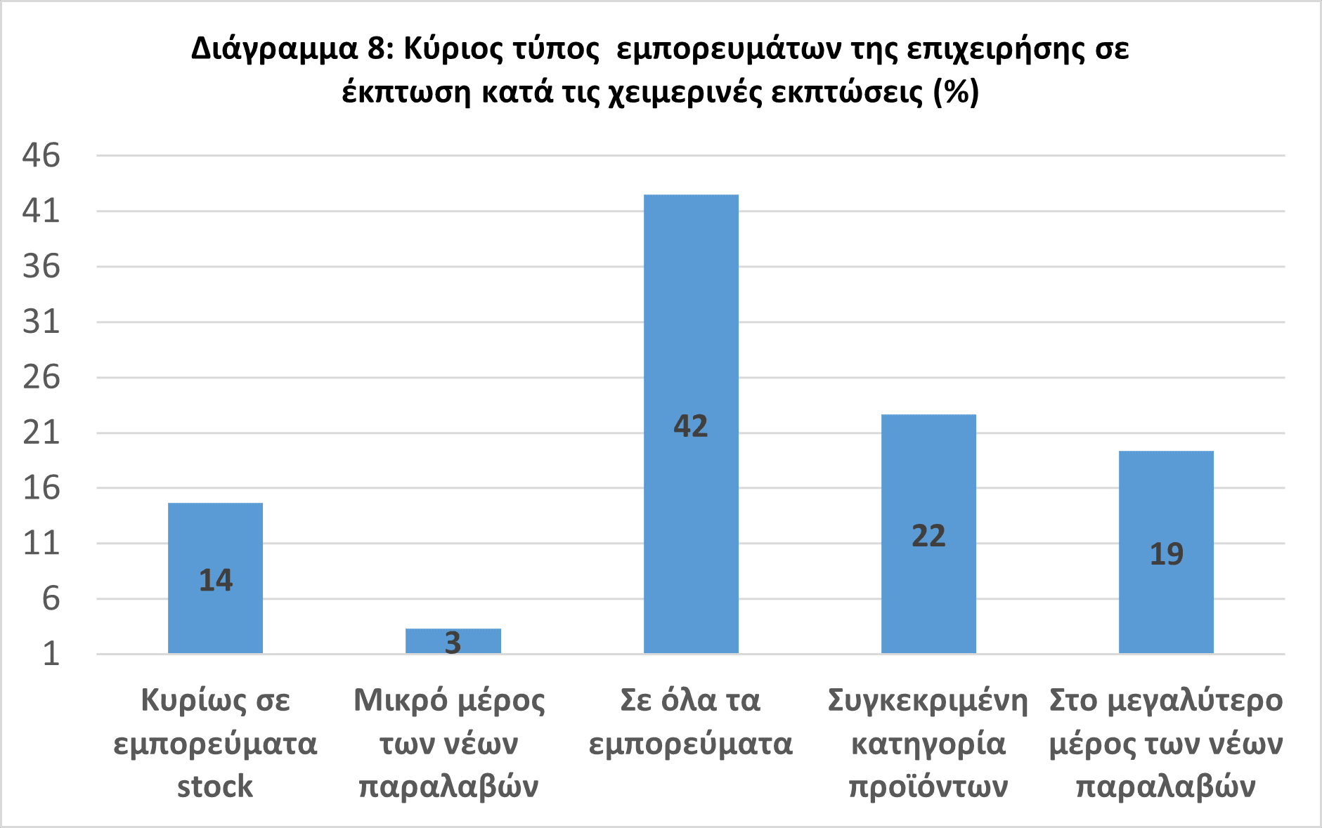 • Τέσσερις στις 10 επιχειρήσεις πραγματοποίησαν εκπτώσεις σε όλα τα εμπορεύματα του καταστήματος. Εντούτοις, σημαντικό μερίδιο (22%) επιχειρηματιών υιοθέτησε εκπτώσεις σε συγκεκριμένα προϊόντα, ενδεχομένως ως επιχειρηματική τακτική, εξαιτίας και της διόγκωσης του κόστους προμηθευτών (Διάγραμμα 8).