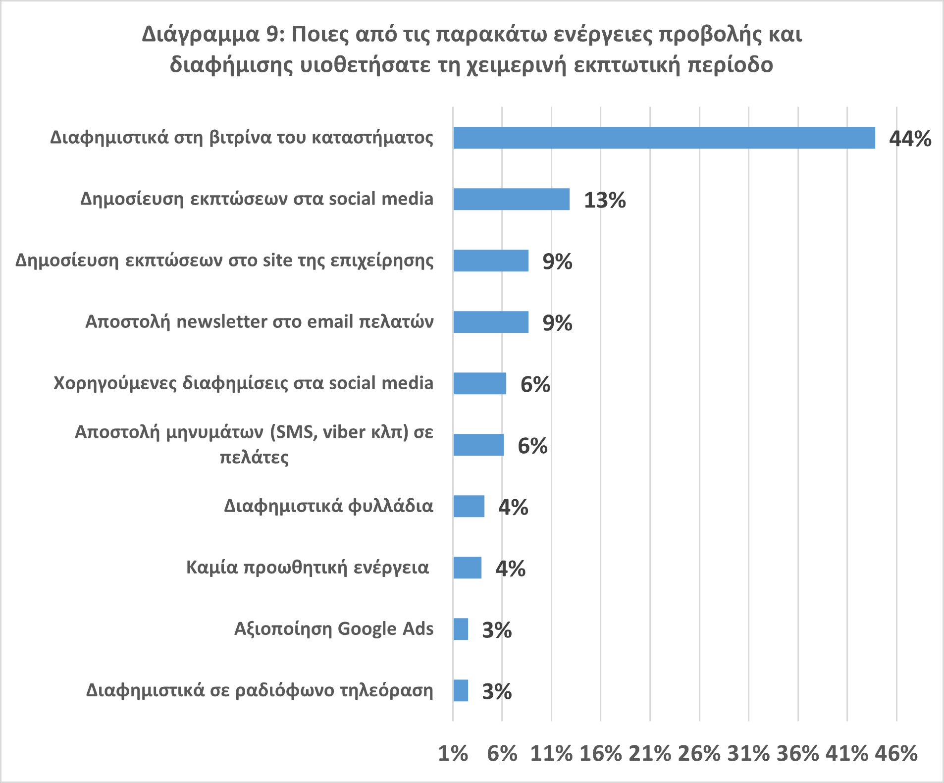 • Κυρίαρχος και με διαφορά από τον επόμενο τρόπος προβολής και διαφήμισης των εκπτώσεων παραμένουν τα σχετικά μηνύματα στη βιτρίνα του καταστήματος ενώ ολοένα και πιο δυναμικό ρόλο φαίνεται να διαδραματίζουν τα social media (Διάγραμμα 9).
