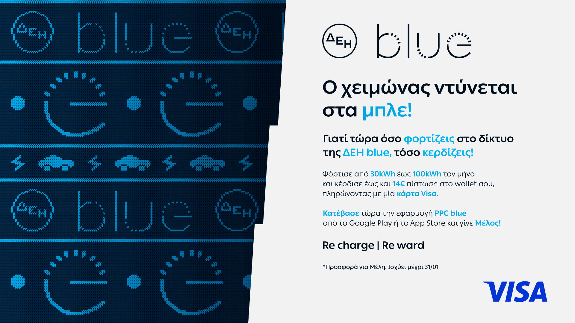 Η ΔΕΗ blue προσφέρει στα μέλη της τη δυνατότητα πίστωσης έως 14€ κάθε μήνα στο ψηφιακό PPC blue πορτοφόλι τους μέσα από την εφαρμογή PPC blue. Συγκεκριμένα, οι χρήστες που φορτίζουν από 30kWh έως 100kWh τον μήνα στο δίκτυο δημόσια προσβάσιμων φορτιστών ΔΕΗ blue και πληρώνουν με κάρτες Visa, λαμβάνουν πίστωση στο τέλος του μήνα, την οποία μπορούν να εξαργυρώσουν για τις επόμενες φορτίσεις τους.