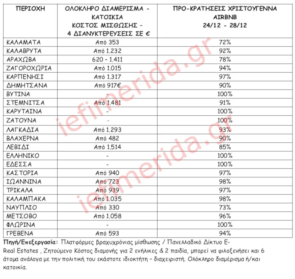 Σύμφωνα με έρευνα του E Real Estates, τα ποσοστά προκρατήσεων στο σύνολο των δημοφιλών χειμερινών προορισμών κυμαίνονται ήδη άνω του 90% στους 19 από τους 23 προορισμούς, Τα υψηλά ποσοστά προκρατήσεων αφορούν αποκλειστικά ακίνητα εγγεγραμμένα σε πλατφόρμες βραχυχρόνιας μίσθωσης και όχι ξενοδοχειακές μονάδες ή πανσιόν.