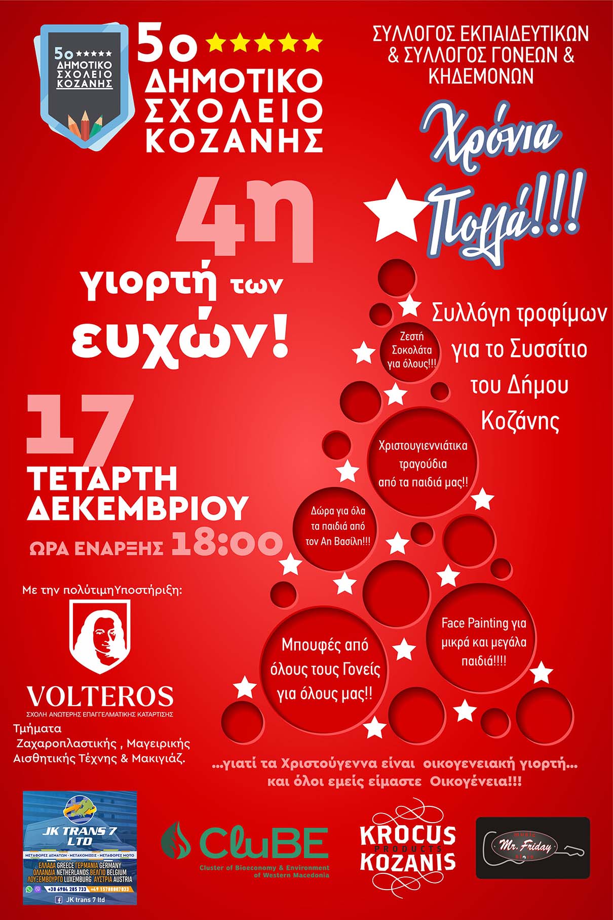 Η Γιορτή των Ευχών πραγματοποιείται με τη στήριξη της σχολής VOLTEROS, καθώς και τοπικών επιχειρήσεων της Κοζάνης, που στηρίζουν και φέτος τη δράση. Οι διοργανωτές καλούν όλους να συμμετάσχουν, να ανταλλάξουν ευχές και να γιορτάσουν το μήνυμα των Χριστουγέννων, που δεν είναι άλλο από την αγάπη, την προσφορά και τη συντροφικότητα.