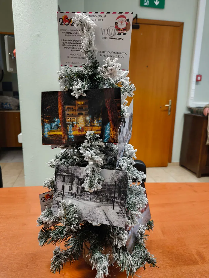 Οι μαθητές προσέφεραν στο Δημαρχείο χριστουγεννιάτικες καρτ ποστάλ με πανέμορφες γιορτινές και χιονισμένες όψεις της Πτολεμαΐδας από φωτογραφίες του Πέτρου Δάλλα, ο οποίος τις παραχώρησε στο 1ο Γυμνάσιο για την πραγματοποίηση του project.