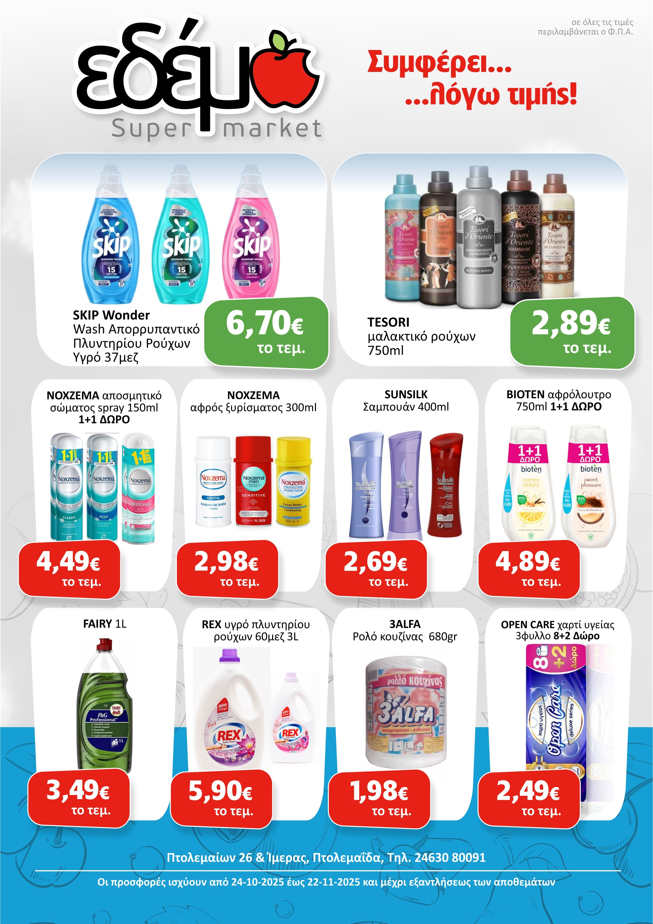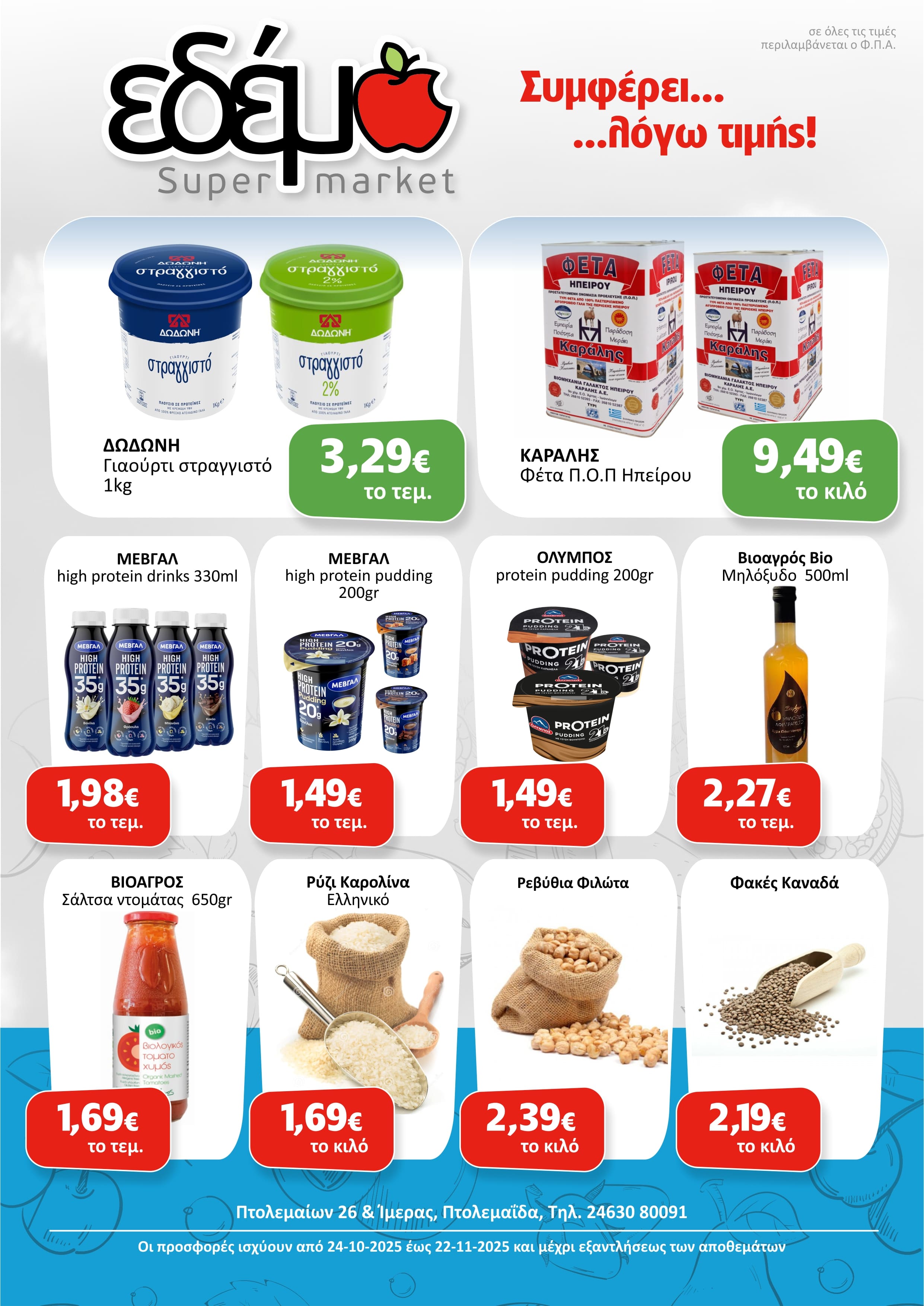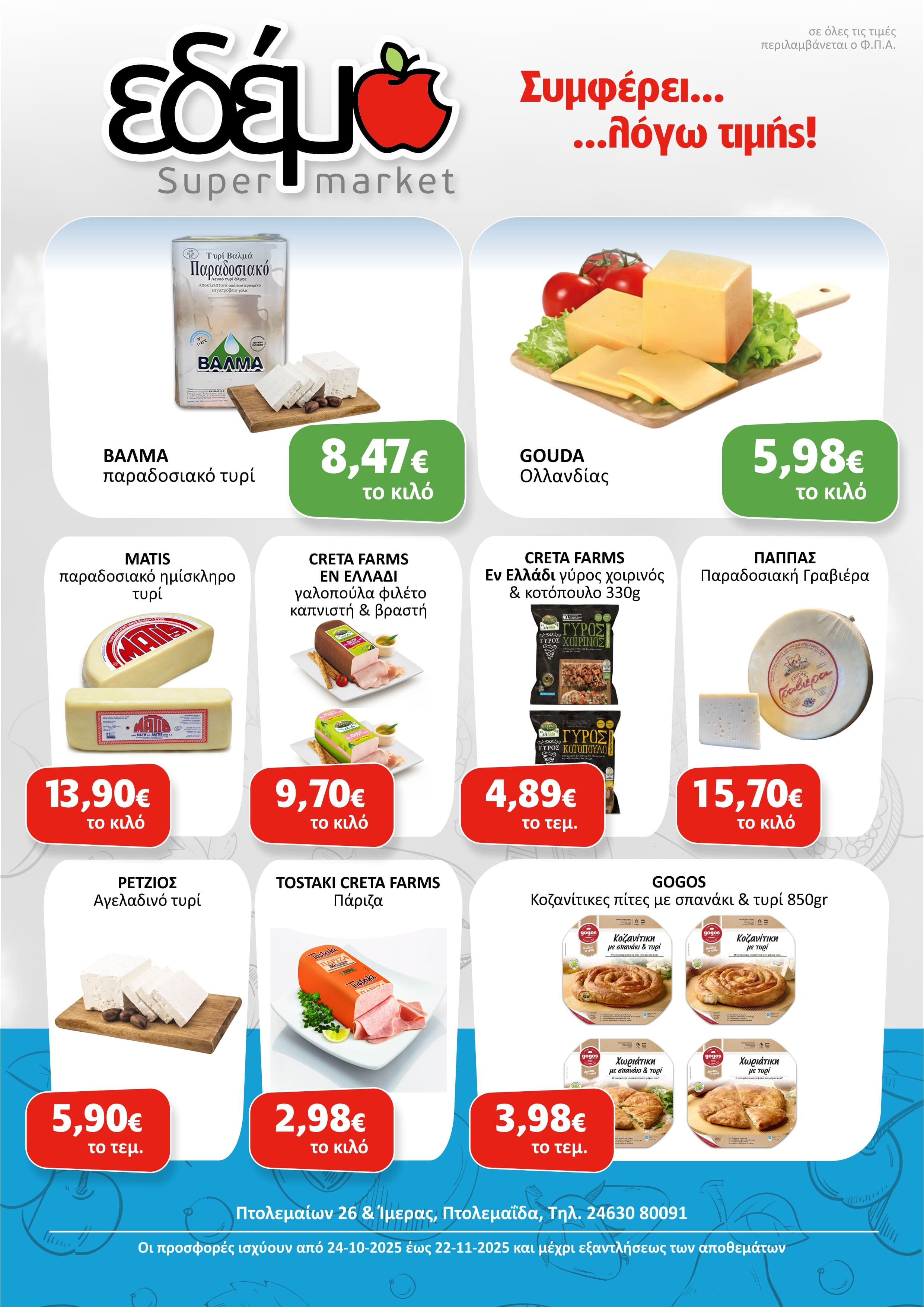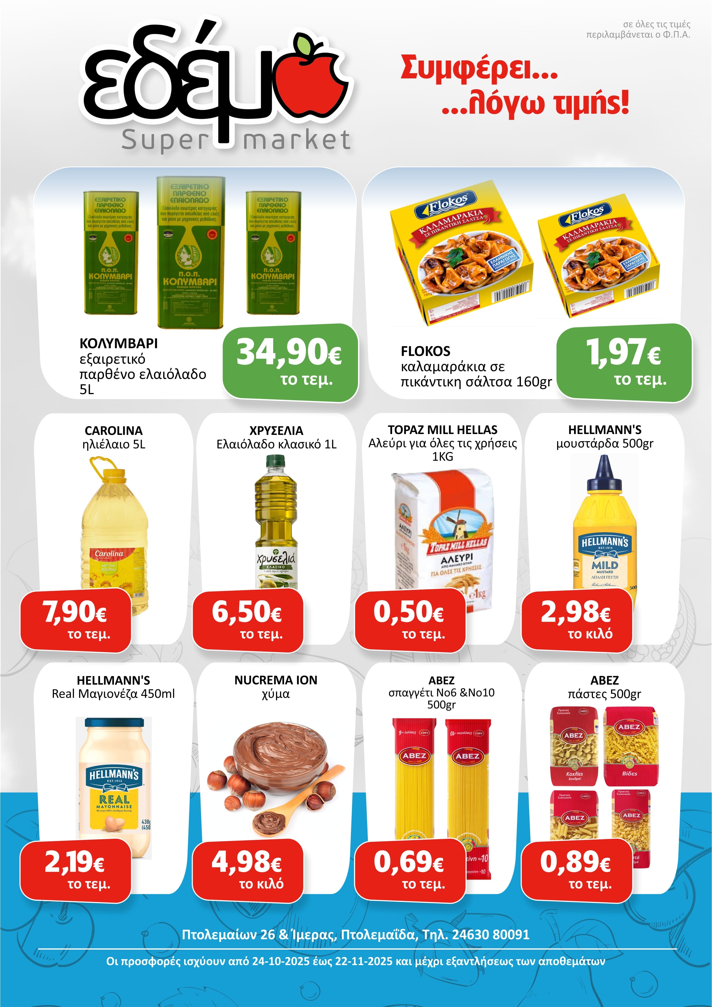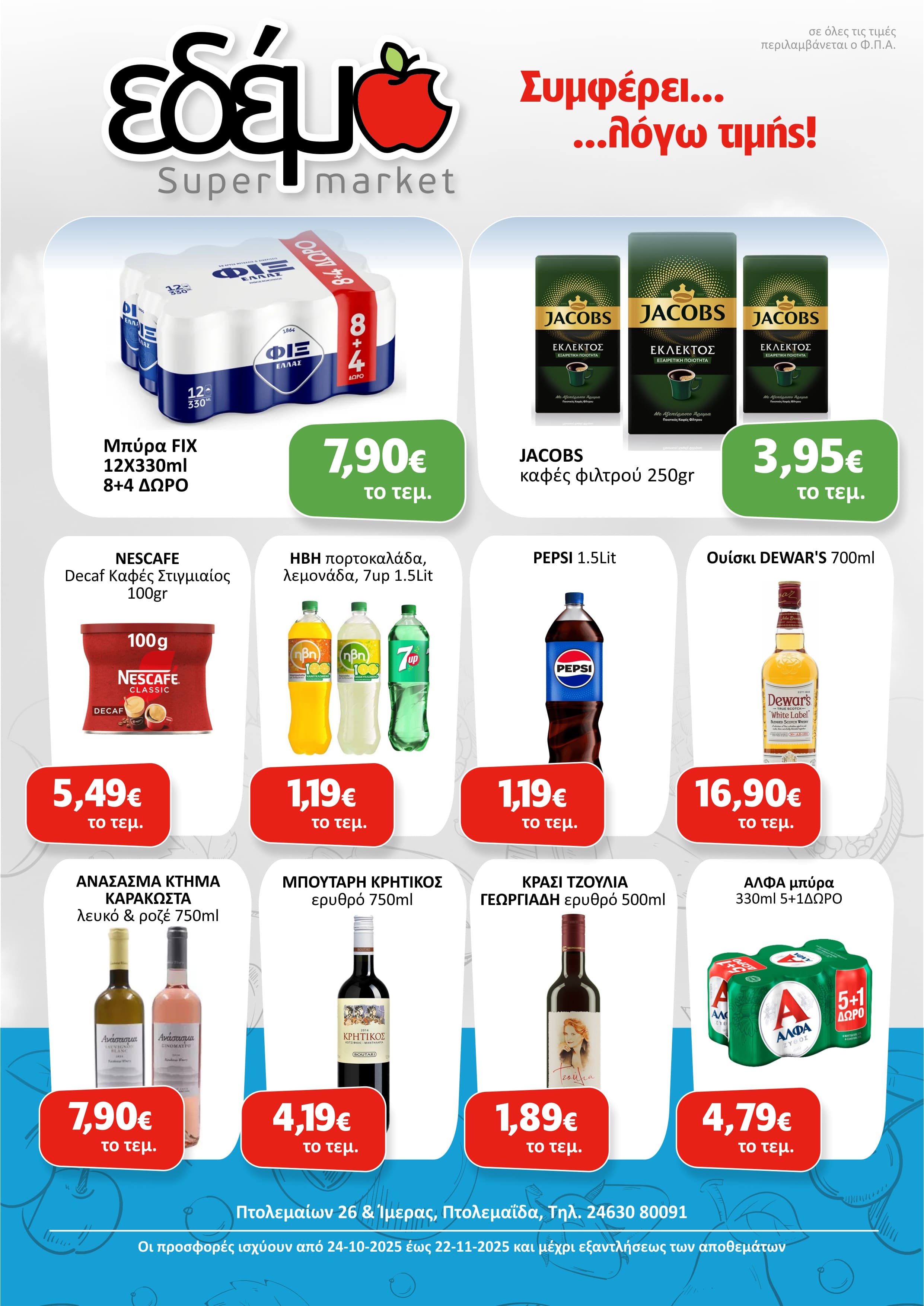 Δείτε παρακάτω το νέο φυλλάδιο προσφορών του super market ΕΔΕΜ στην Πτολεμαΐδα που ισχύει από 24/10/2025 έως 22/11/2025.