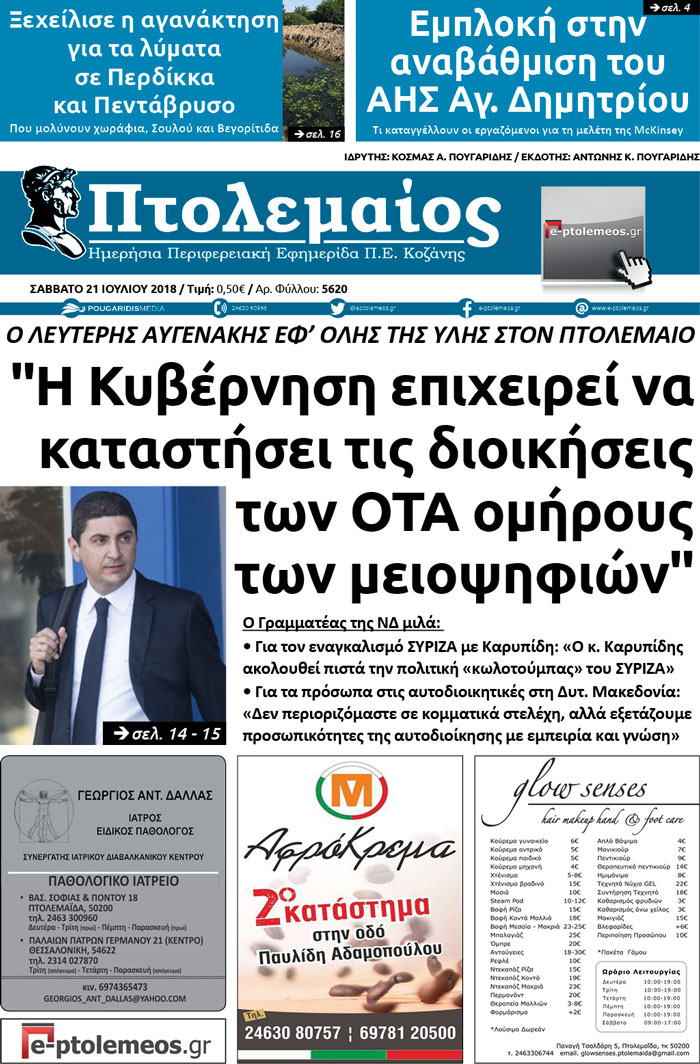 Δείτε το πρωτοσέλιδο του Πτολεμαίου του Σαββάτου 21/07/2018