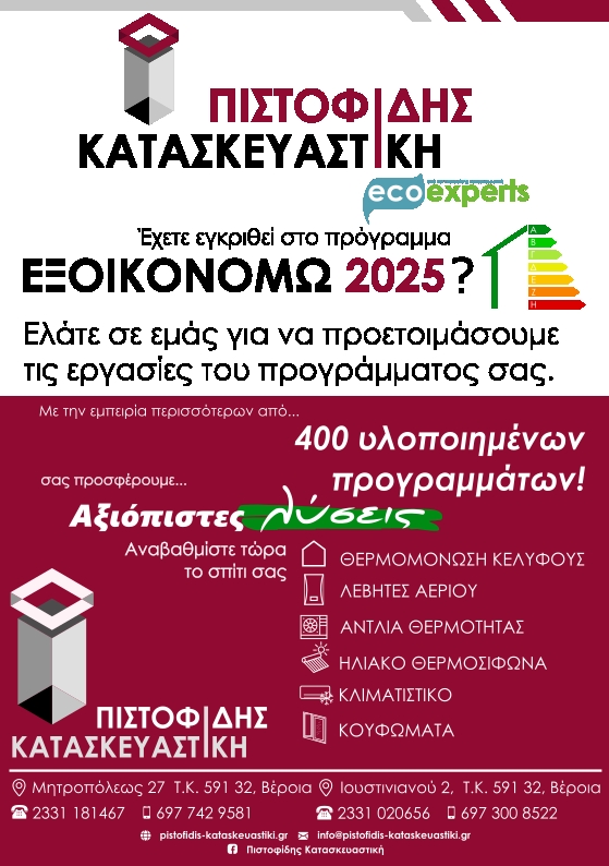 Tags: Εξοικονομώ 2025Εξοικονομώ κατ΄οίκονΠιστοφίδης Κατασκευαστική