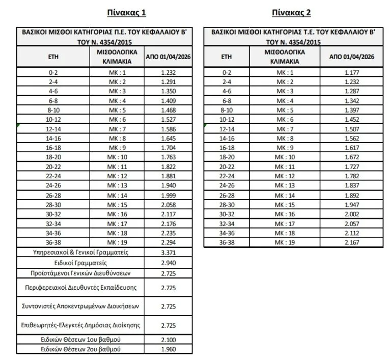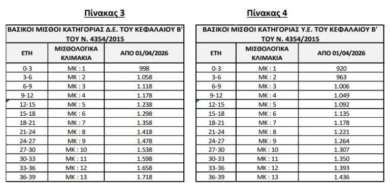 Στην βάση των παραπάνω οι βασικοί μισθοί των μισθολογικών κλιμακίων του προσωπικού του δημοσίου τομέα, αυξήθηκαν από 1.4.2026 κατά σαράντα 40 ευρώ ακολουθώντας την αύξηση του κατώτατου μισθού.