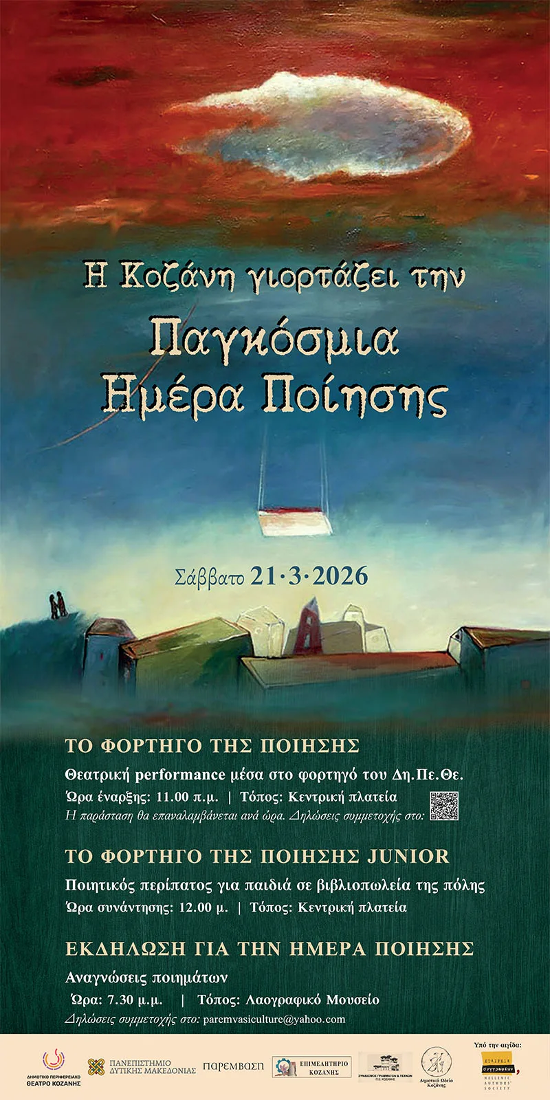 Το απόγευμα της 21ης Μαρτίου, το Λογοτεχνικό Περιοδικό Παρέμβαση, στο Λαογραφικό Μουσείο Κοζάνης, θα πραγματοποιήσει εκδήλωση αφιερωμένη στην Ημέρα Ποίησης. Ηθοποιοί του Δη.Πε.Θε., ποιητές του τόπου και φίλοι της λογοτεχνίας θα διαβάσουν ποιήματα δικά τους ή της επιλογής τους. Μέσα από τη ζωντανή απαγγελία και τη συνάντηση διαφορετικών φωνών, η ποίηση θα βρεθεί στο επίκεντρο, αναδεικνύοντας τη δύναμη του λόγου να συγκινεί και να εμπνέει. Η εκδήλωση θα πραγματοποιηθεί σε συνδιοργάνωση με την Εταιρεία Συγγραφέων, το Δη.Πε.Θε. Κοζάνης και τον Σύνδεσμο Γραμμάτων και Τεχνών. Μουσική: Βαγγέλης Μαραμής. Δηλώσεις συμμετοχής: paremvasiculture@yahoo.com