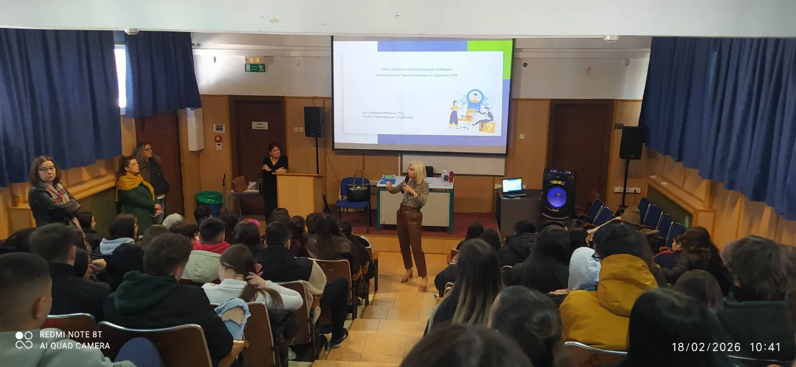 Η δράση απευθυνόταν στους μαθητές της Α’ τάξης, που θα επιλέξουν τομέα σπουδών, και της Γ’ τάξης, που προετοιμάζονται για τις Πανελλαδικές Εξετάσεις. Το αμφιθέατρο ήταν γεμάτο και το ενδιαφέρον των μαθητών ιδιαίτερα έντονο, ενώ ακολούθησε ουσιαστική και εποικοδομητική συζήτηση.