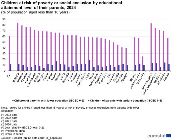 Επιπλέον, η Eurostat εντοπίζει σημαντική συσχέτιση ανάμεσα στο μορφωτικό επίπεδο των γονέων και τον κίνδυνο φτώχειας: το 61,2% των παιδιών με γονείς χαμηλής εκπαίδευσης (ISCED 0–2) κινδυνεύει από φτώχεια, έναντι μόλις 11% για παιδιά με γονείς ανώτατης εκπαίδευσης (ISCED 5–8).