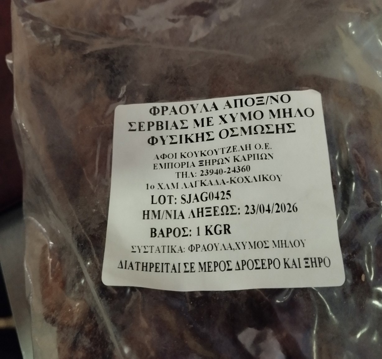 Το Τμήμα Εμπορίου της Δ/νσης Ανάπτυξης της Περιφερειακής Ενότητας Ξάνθης στο πλαίσιο προγράμματος συνεργασίας με τον ΕΦΕΤ έτους 2025 για τον έλεγχο προσθέτων τροφίμων και αρωματικών ουσιών σε διάφορα είδη τροφίμων, προέβη σε δειγματοληψία τροφίμου με στοιχεία «Φράουλα αποξηραμένη με χυμό μήλου φυσικής όσμωσης» προέλευσης Σερβίας σε πλαστική κλειστή συσκευασία 1Kg, με αριθμό παρτίδας SJAG0425, ανάλωση κατά προτίμηση πριν από: 23/04/2026, που διατίθεται από την επιχείρηση «ΑΦΟΙ ΚΟΥΚΟΥΤΖΕΛΗ Ο.Ε.» με έδρα στον 1ο χλμ Λαγκαδά-Κολχικού.