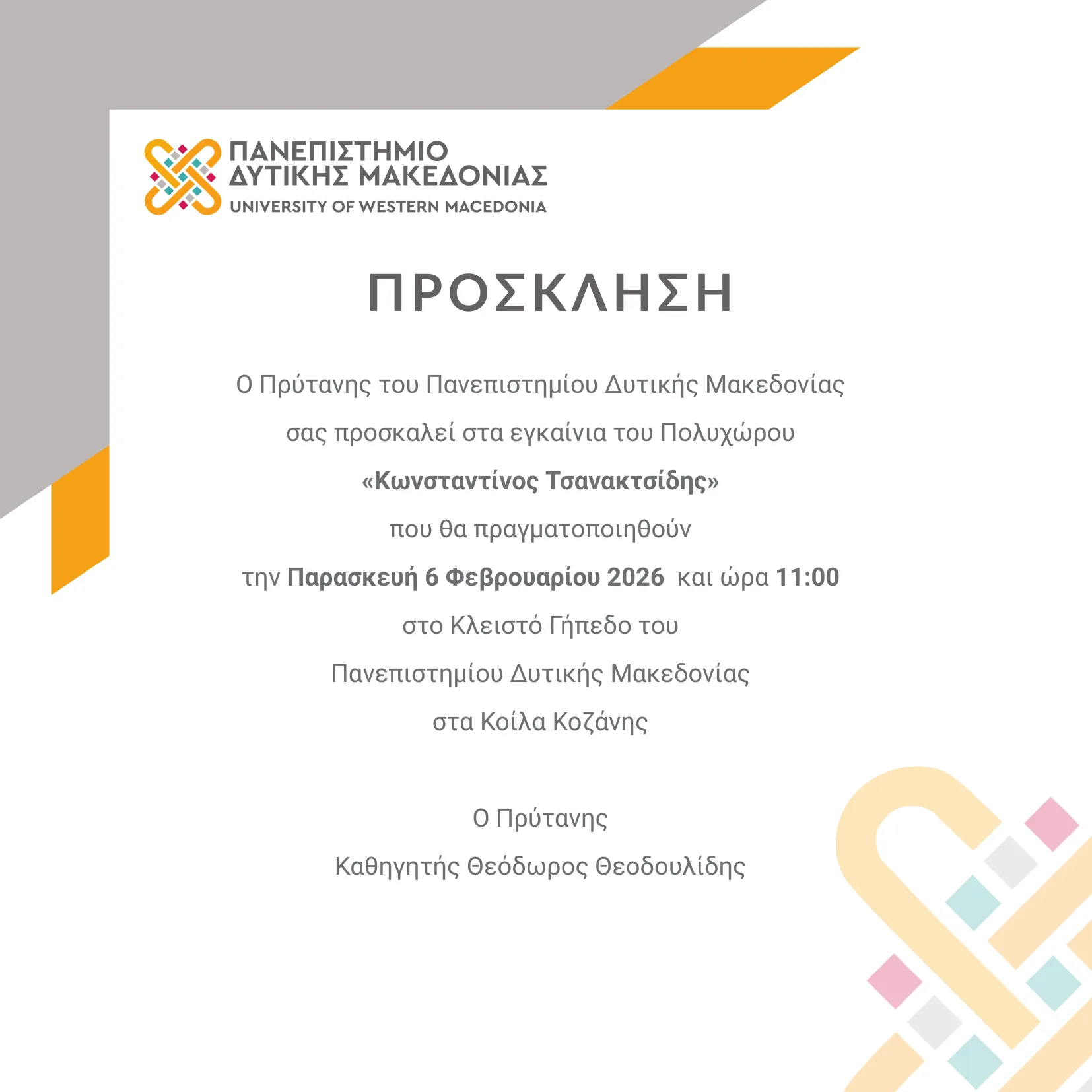 Ο Πρύτανης του Πανεπιστήμιο Δυτικής Μακεδονίας εγκαινιάζει τον Πολυχώρο «Κωνσταντίνος Τσανακτσίδης», σε εκδήλωση που θα πραγματοποιηθεί την Παρασκευή 6 Φεβρουαρίου 2026 και ώρα 11:00, στο Κλειστό Γήπεδο του Πανεπιστημίου Δυτικής Μακεδονίας, στα Κοίλα Κοζάνης.