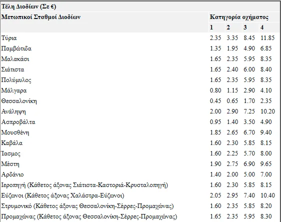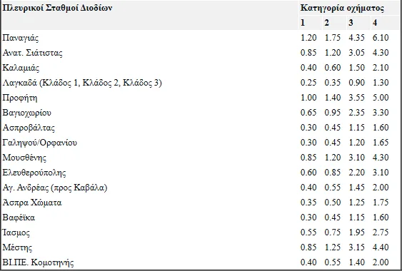 Οι τιμές ανά μετωπικό και πλευρικό σταθμό διοδίων