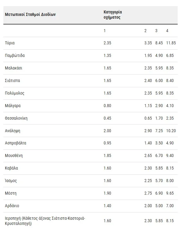 Οι νέες τιμές ανά μετωπικό και πλευρικό σταθμό διοδίων στην Εγνατία Οδό: